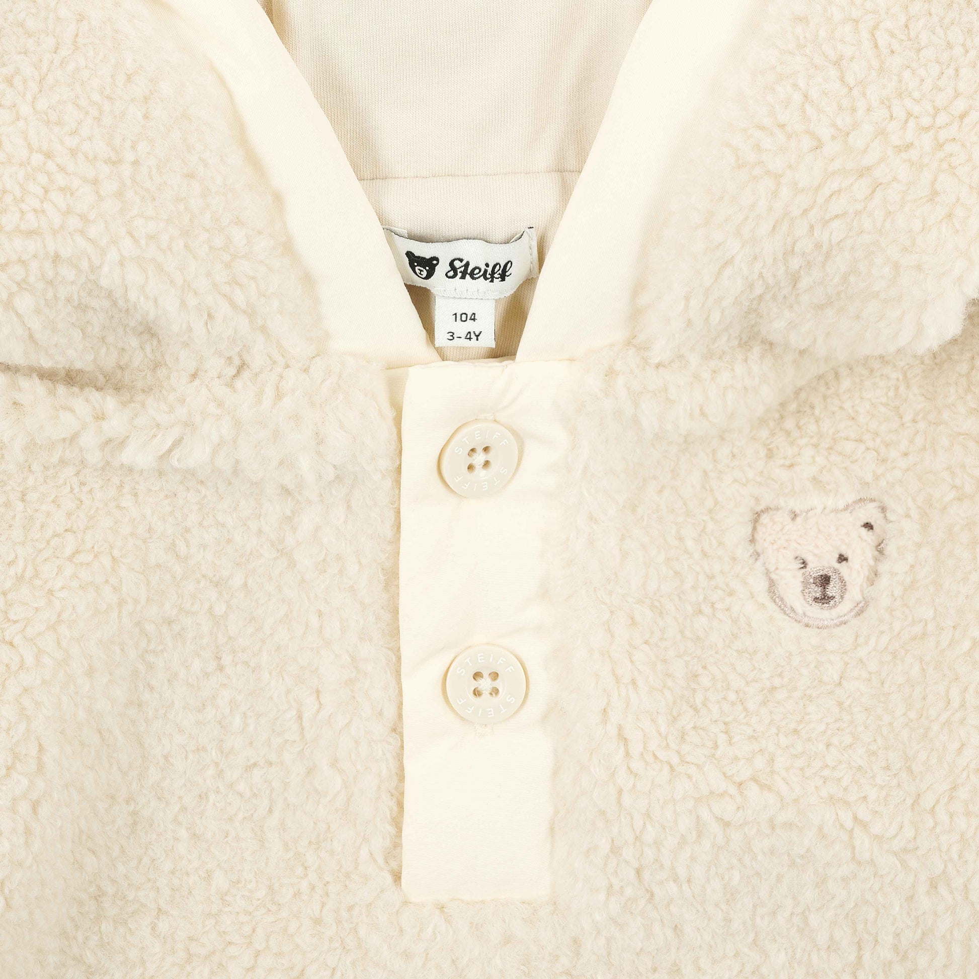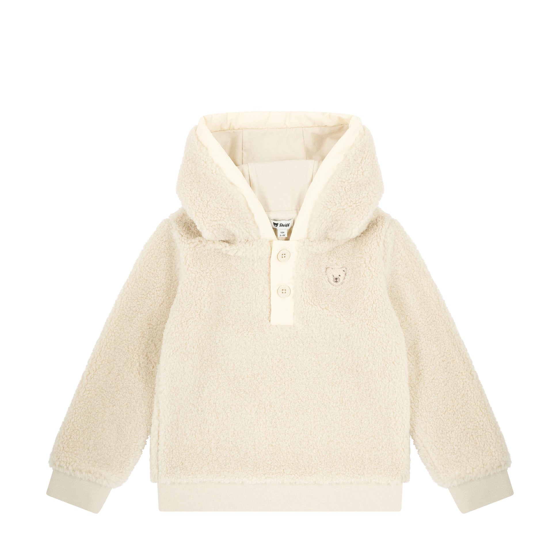 Ein echtes Wohlfühlstück für kühle Tage: Dieses Kapuzen-Sweatshirt aus weichem Teddyfleece begeistert mit seinem besonders gemütlichen Tragegefühl. In warmem Beige gehalten und locker geschnitten, bietet das Sweatshirt viel Bewegungsfreiheit für aktive Abenteurer. Die gefütterte Kapuze und die gerippten Abschlüsse sorgen für zusätzlichen Komfort. Die Knopfleiste auf der Vorderseite ist mit detailverliebten Steiff Logo-Knöpfen versehen und unterstreicht den charmanten Look. Auf der Brust sorgt das klassische Steiff Teddybärmotiv für ein liebevolles Detail und begleitet durch jeden Tag – ein kuscheliger Lieblingsbegleiter mit Stil.
