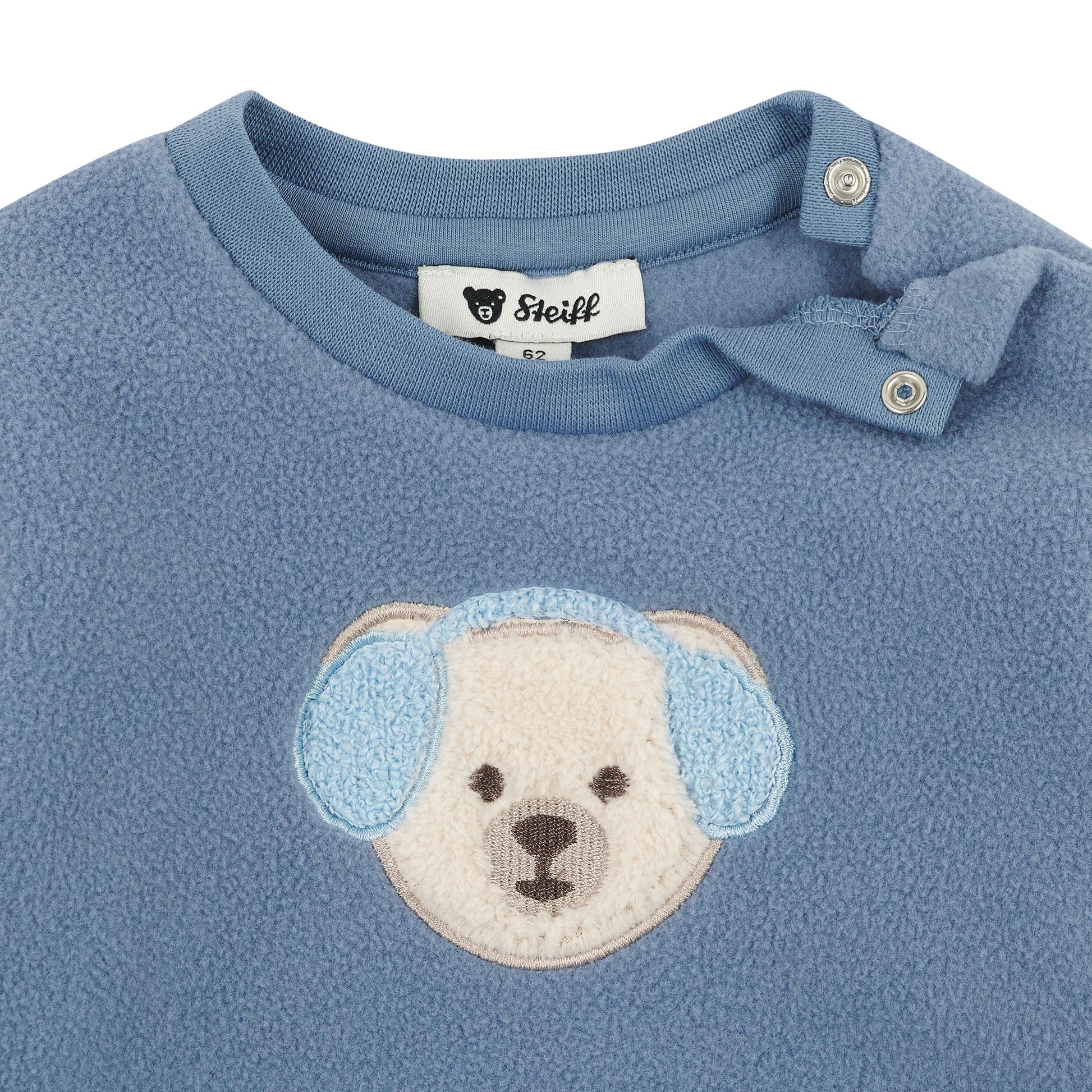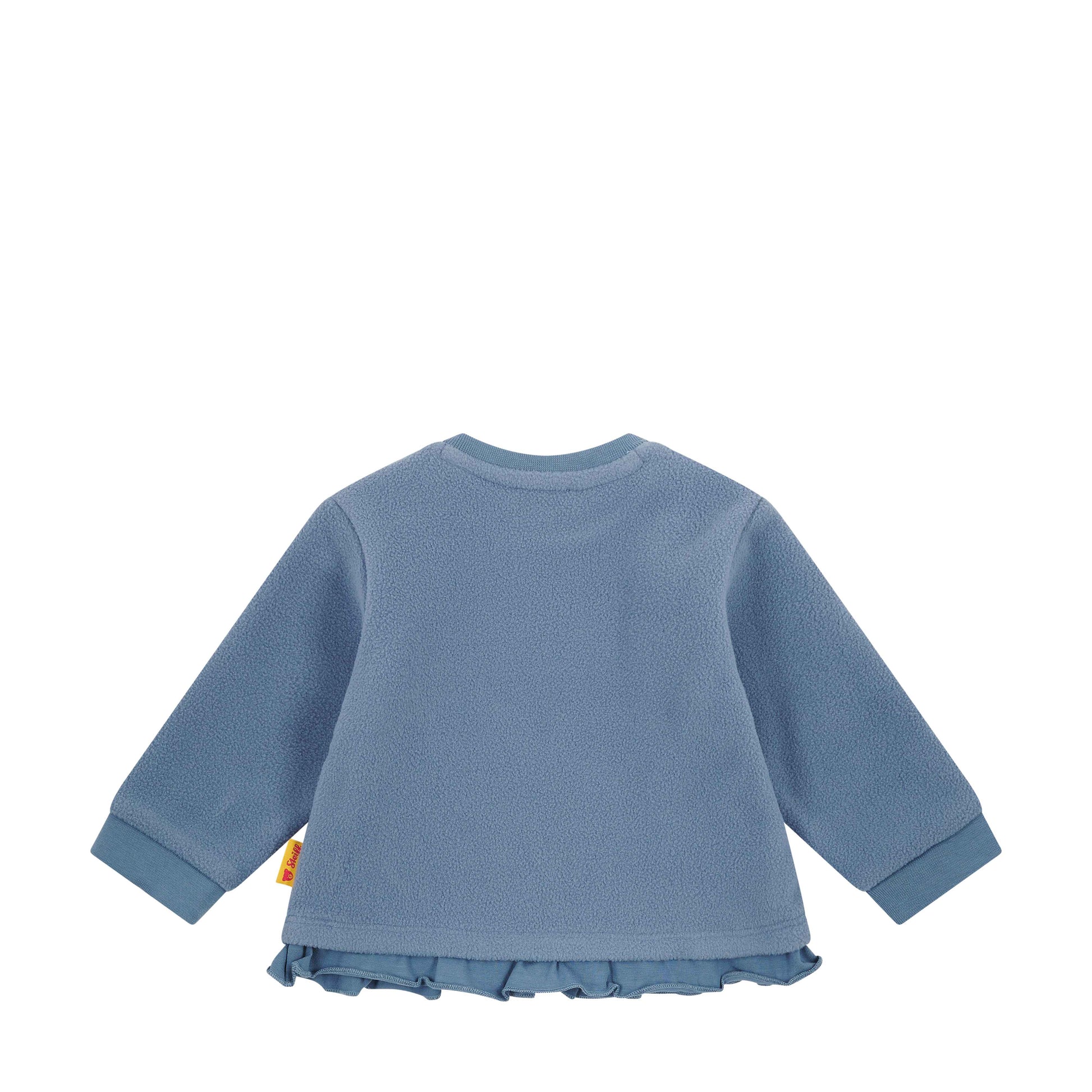 Ein kuscheliges Must-have für stilbewusste Weltentdeckerinnen. Dieses weiche Sweatshirt aus Fleece hält angenehm warm und überzeugt mit einem bequemen, weit geschnittenen Schnitt. Zarte Rüschen am Saum verleihen dem einfarbigen Design in Blau einen verspielten Touch. Der Rundhalsausschnitt mit Rippbündchen und praktische Druckknöpfe an der Schulter erleichtern das Anziehen. Auf der Vorderseite sorgt das klassische Steiff Teddybärmotiv mit flauschigen Ohrenschützern für ein liebevolles Detail – ein Wohlfühlteil mit Lieblingsstück-Potenzial.