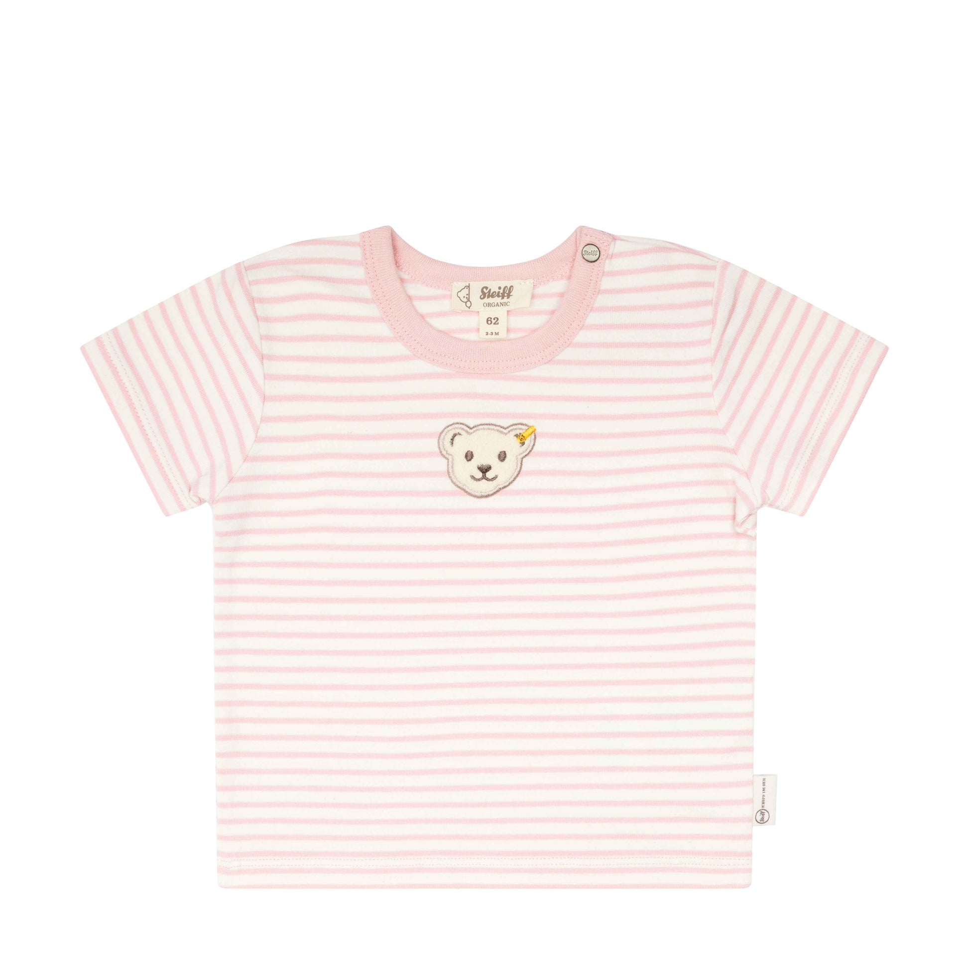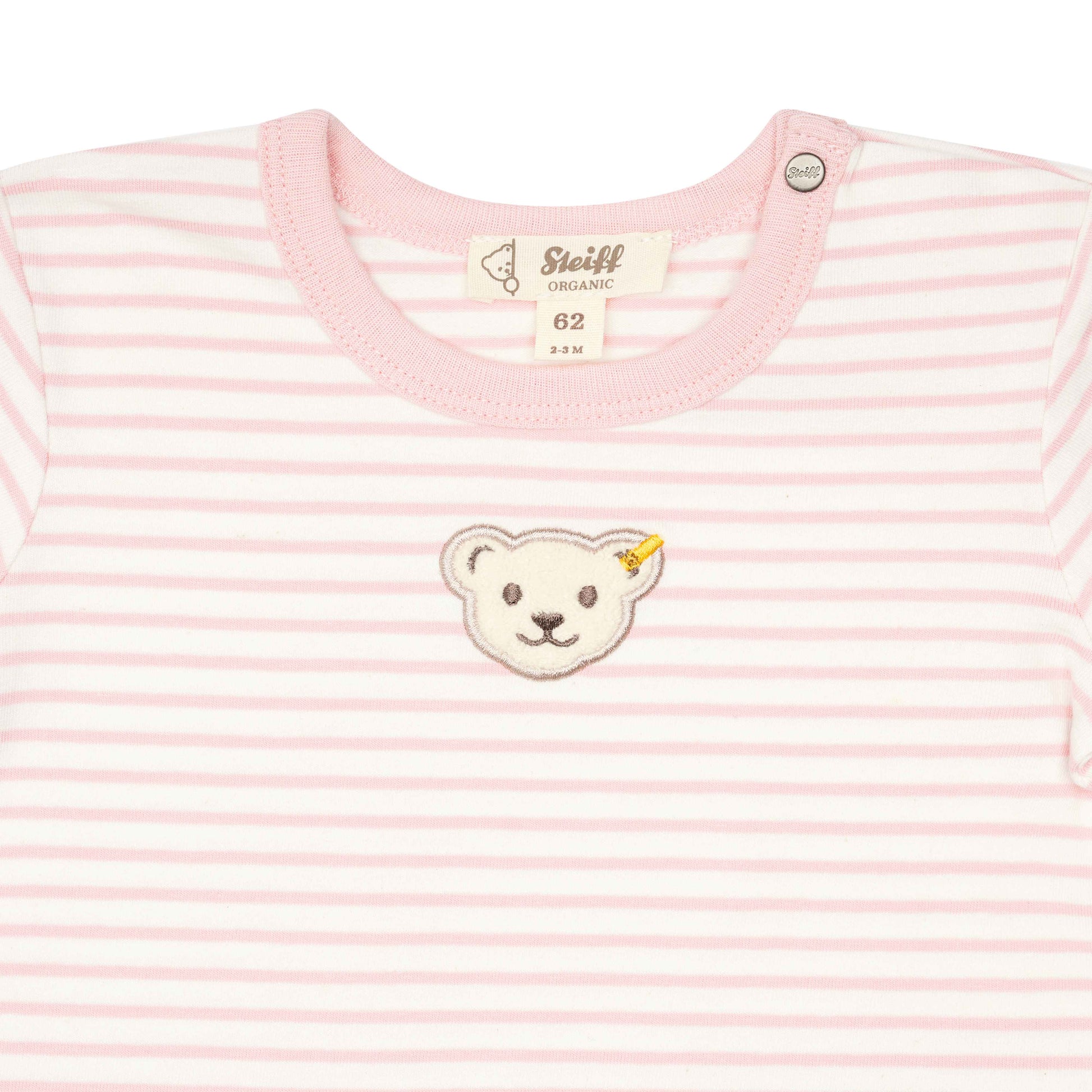 Im Streifenlook geht es mit diesem T-Shirt zu Ausflügen und Abenteuern. Leichter, sehr weicher Jersey bietet ein herrliches Tragegefühl. Druckknöpfchen auf der Schulter ermöglichen unkompliziertes Hineinschlüpfen und Wohlfühlen. Lockere Passform und flexible Bündchen schenken viel Bewegungsfreiheit beim Weltentdecken. Ihr Kleines wird unterwegs von einem flauschigem Steiff Teddybärmotiv auf der Brustmitte begleitet. Süßer Allrounder! Das T-Shirt ist aus Bio-Baumwolle gefertigt und GOTS zertifiziert.
