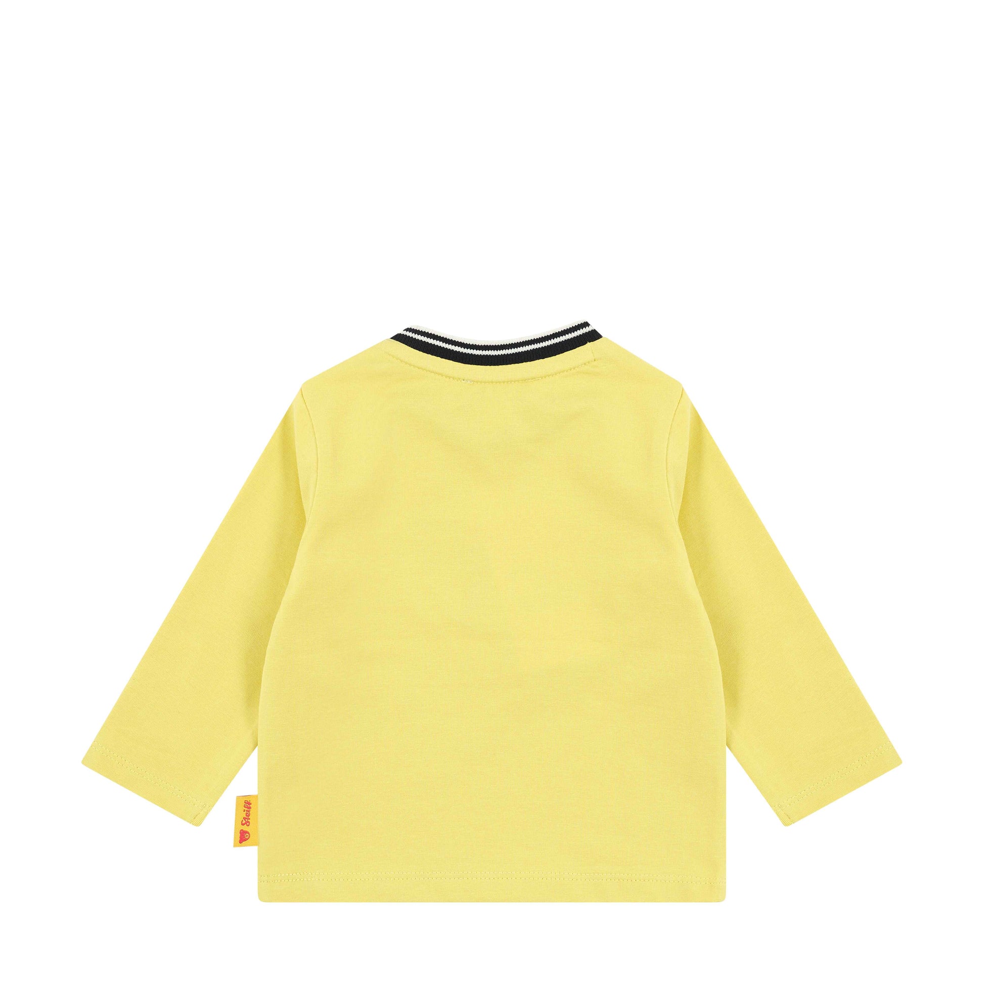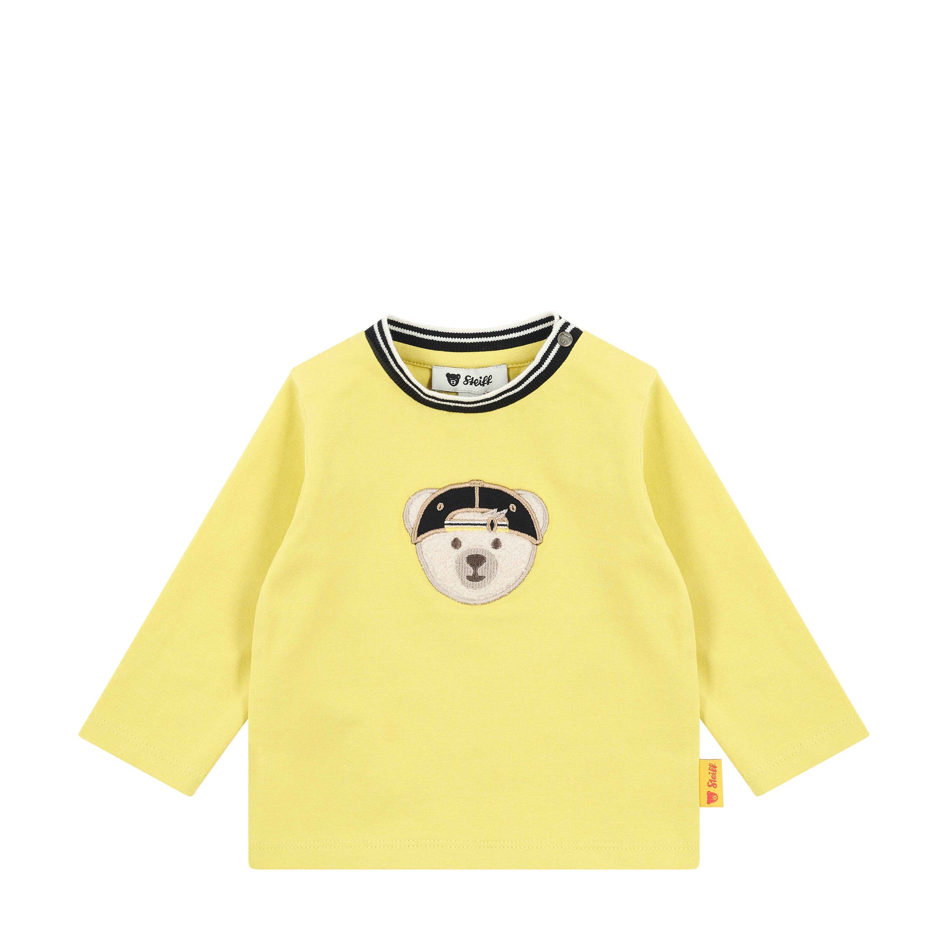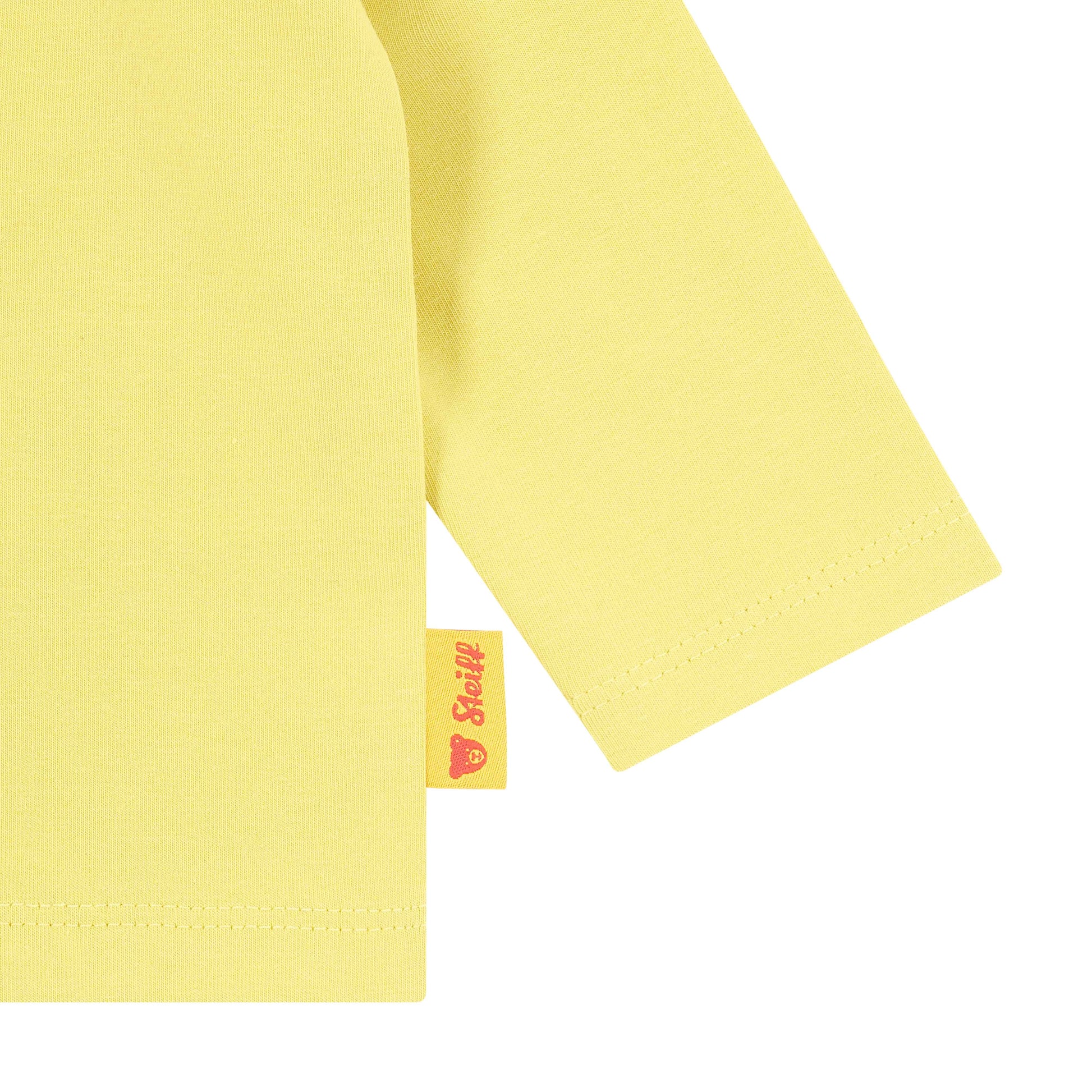 Für kleine Entdecker ist dieses Langarmshirt in frischem Gelb ein echtes Lieblingsstück. Der weiche Single Jersey bietet angenehmen Tragekomfort und viel Bewegungsfreiheit beim Krabbeln und Spielen. Der gerippte Rundhalsausschnitt mit kontrastfarbigen Streifen verleiht dem Shirt einen sportlichen Touch. Highlight ist das Teddybärmotiv auf der Vorderseite – der klassische Steiff Teddybär trägt eine coole Kappe und setzt damit einen verspielten Akzent. Praktische Druckknöpfe an der Schulter erleichtern das An- und Ausziehen. Ein fröhlicher Begleiter für jeden Tag.