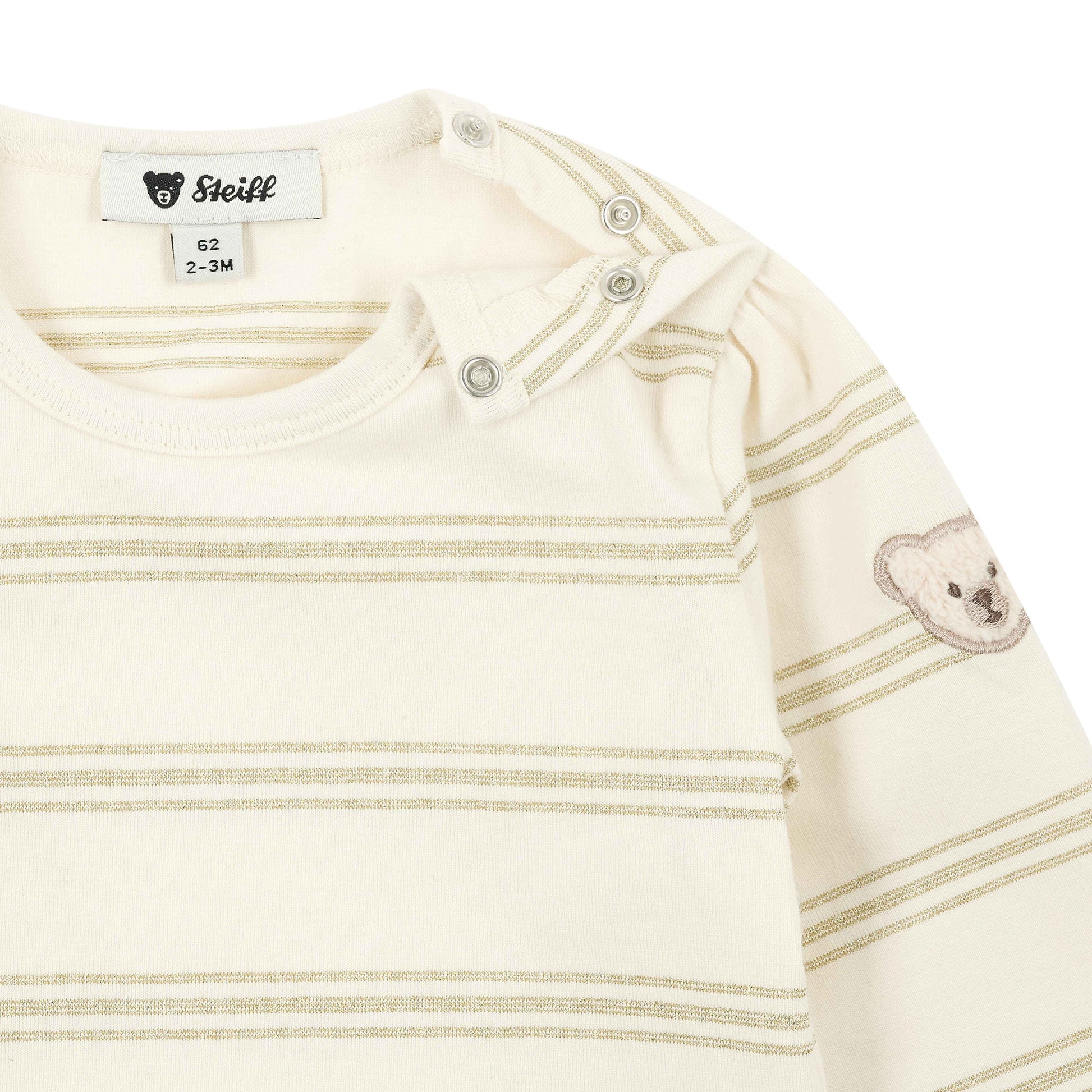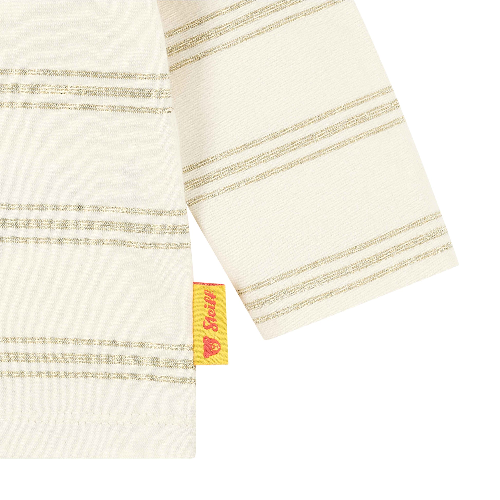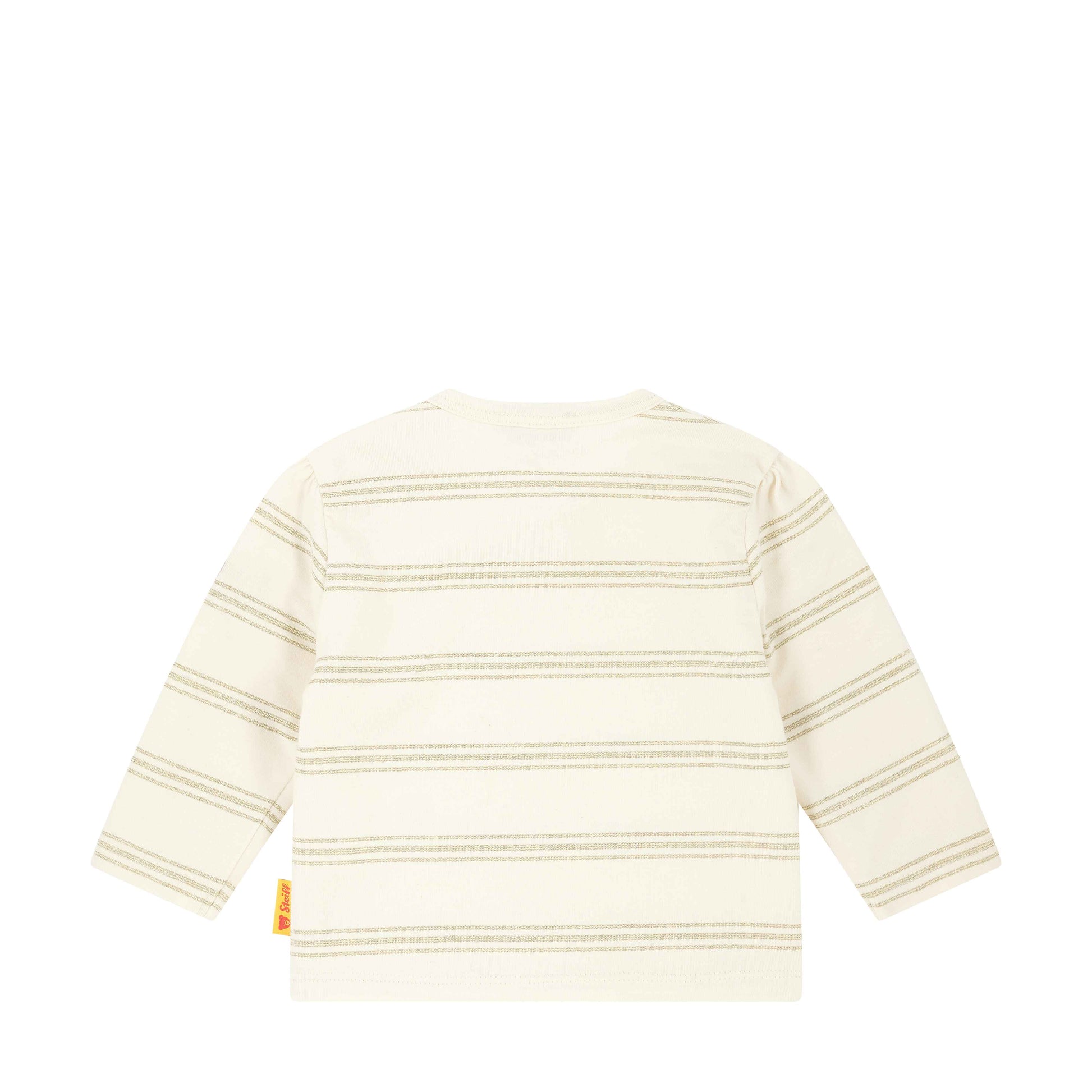 Dieses gestreifte Langarmshirt aus weichem Single Jersey begleitet modebewusste Weltentdeckerinnen stilvoll durch den Tag. Goldfarbene Streifen sorgen für einen edlen Akzent, während sanfte Raffungen an den Schultern dem Look eine verspielte Note verleihen. Dank praktischer Druckknöpfe an der Schulter gelingt das An- und Ausziehen ganz unkompliziert. Auf dem linken Ärmel befindet sich das klassische Steiff Teddybärmotiv und schenkt ein Gefühl von Geborgenheit – ein charmantes Lieblingsteil für jeden Anlass.