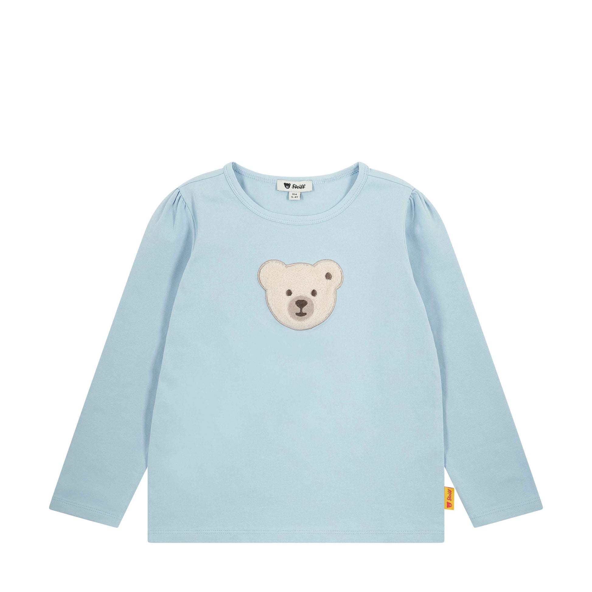 Mit diesem süßen Langarmshirt wird jeder Tag ein kleines Abenteuer für stilbewusste Weltentdeckerinnen. Gefertigt aus weichem Single Jersey bietet es angenehmen Tragekomfort und viel Bewegungsfreiheit – perfekt zum Spielen, Kuscheln und Entdecken. Die zarten Raffungen an den Schultern verleihen dem Shirt eine mädchenhafte Note. Das absolute Highlight ist das große Steiff Teddybärmotiv mit integrierter Quietsche, der für fröhliche Überraschungsmomente sorgt. In zartem Hellblau gehalten, lässt sich das Shirt vielseitig kombinieren – ein charmantes Lieblingsstück mit Spielspaß und Wohlfühlgarantie.