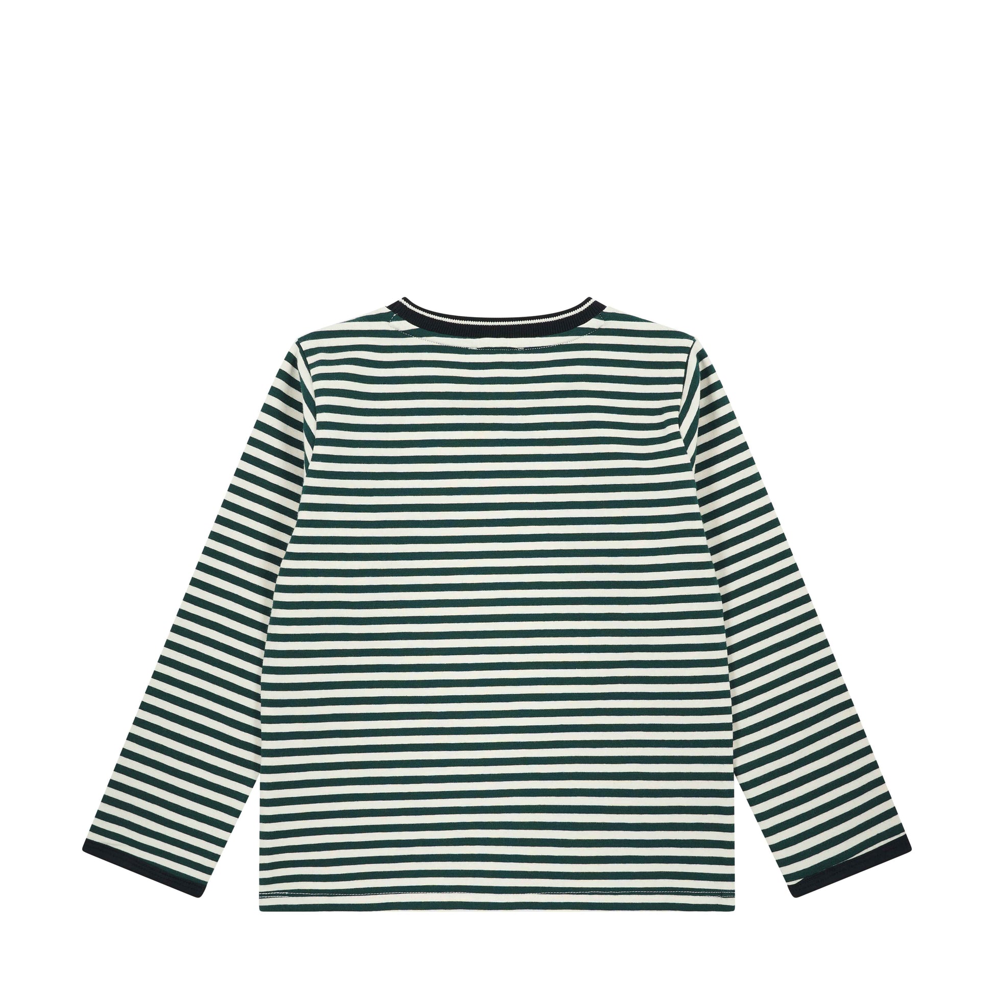 Kleine Entdecker sind mit diesem gestreiften Langarmshirt stilvoll unterwegs. Der weiche Single Jersey bietet angenehmen Tragekomfort und Bewegungsfreiheit, während der gerade Schnitt mit geripptem Rundhalsausschnitt für eine perfekte Passform sorgt. Das klassische Streifendesign in Dunkelgrün und Beige verleiht dem Shirt eine frische Note. Auf der Brust sorgt das Steiff Teddybärmotiv für einen liebevollen Akzent und begleitet coole Jungs auf all ihren Abenteuern – ein charmantes Basic mit Wohlfühlgarantie.
