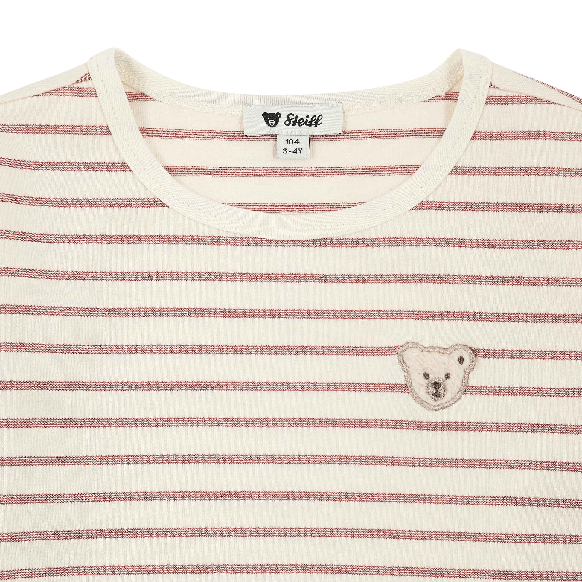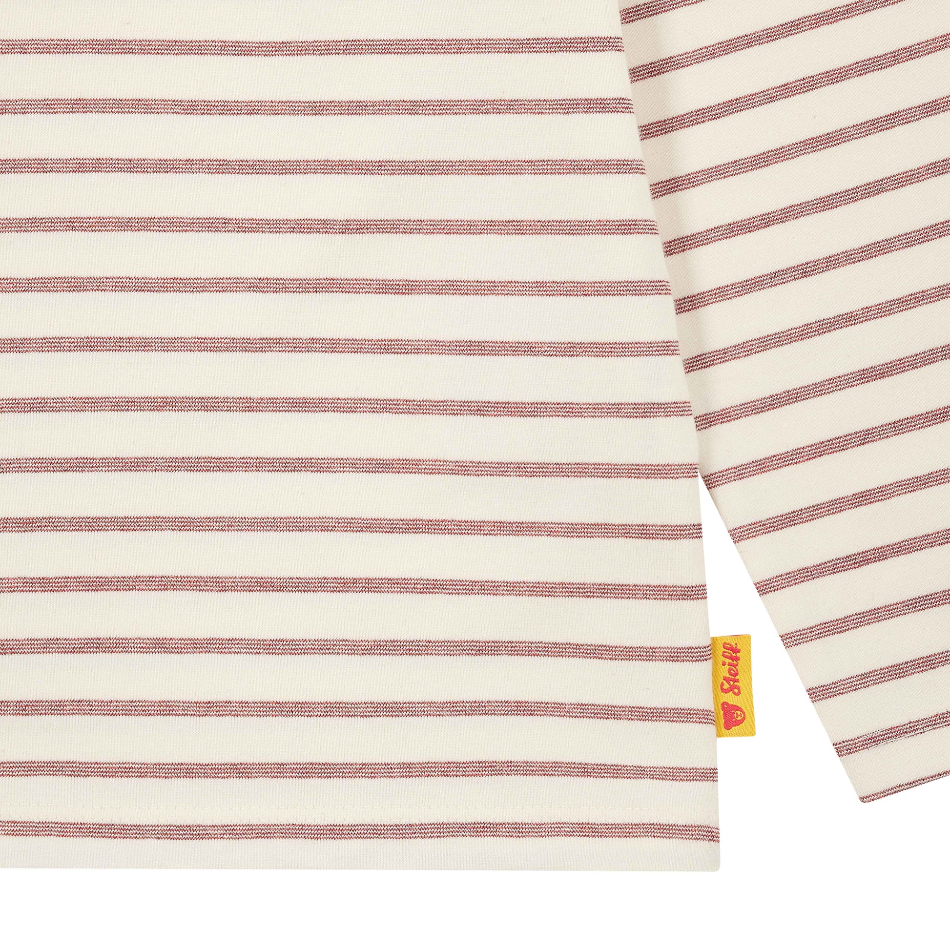 Ein fröhlicher Alltagsbegleiter für kleine Stilikonen – mit einem Hauch Glamour. Dieses Langarmshirt aus weichem Single Jersey bietet dank gerader Passform und angenehmem Material rundum Wohlgefühl. Das klassische Streifenmuster in Beige und Rot wird durch feine, metallisch glänzende Kontraststreifen stilvoll aufgewertet. Zarte Raffungen an der Schulternaht verleihen dem Shirt eine verspielte Note. Auf der Brust rundet das ikonische Steiff Teddybärmotiv den Look liebevoll ab – ein charmantes Lieblingsstück für stilbewusste Weltentdeckerinnen.