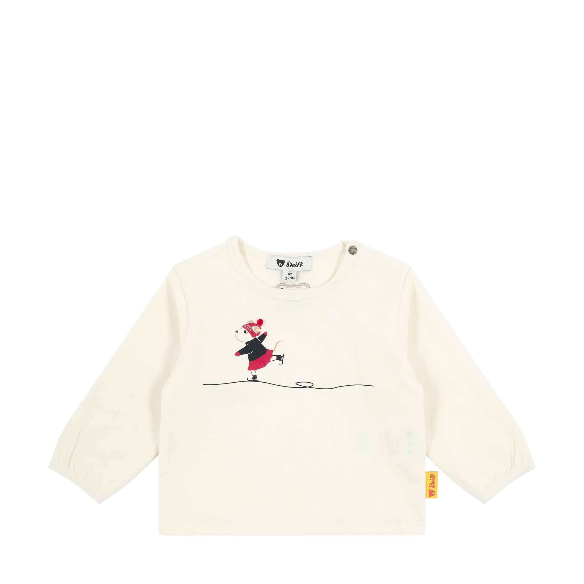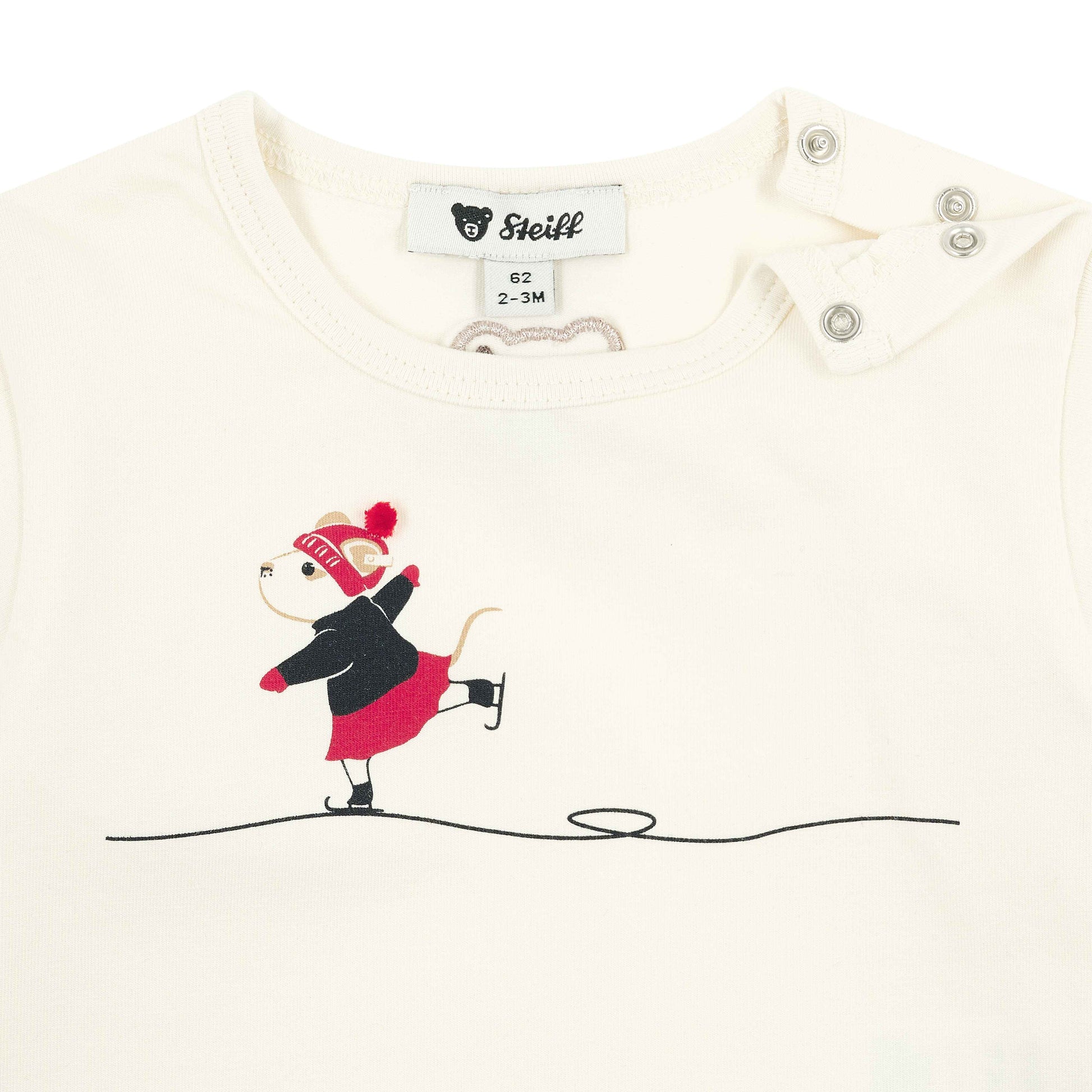 Für kleine Entdeckerinnen, die auch bei kühlem Wetter nicht stillsitzen wollen. Dieses langärmelige T-Shirt aus weichem Single Jersey bietet gemütlichen Komfort und einen charmanten Look. Der weite Schnitt sorgt für Bewegungsfreiheit, während Druckknöpfe an der Schulter das An- und Ausziehen erleichtern. Auf der Vorderseite begeistert ein liebevoll gestalteter Print mit einer schlittschuhfahrenden Maus – ein echter Hingucker für fröhliche Wintertage.