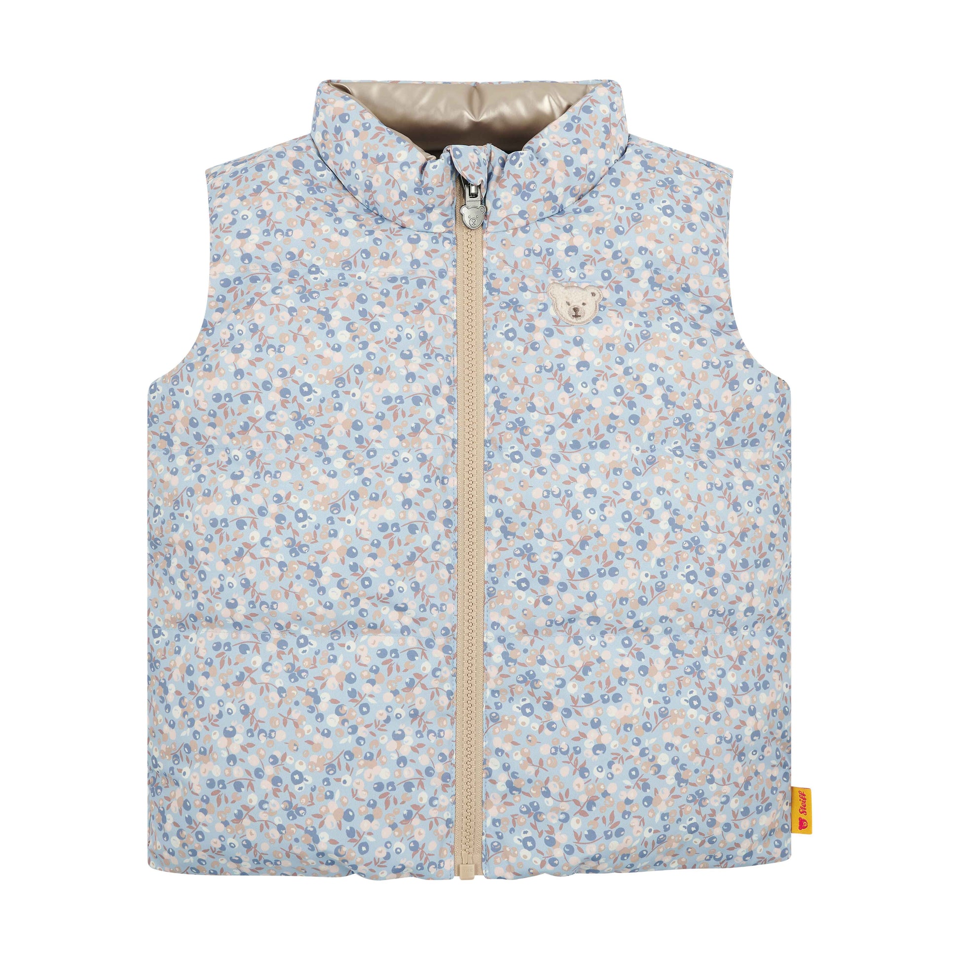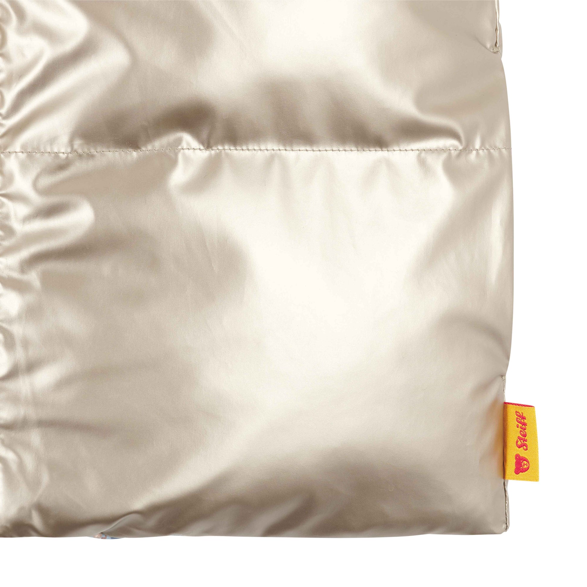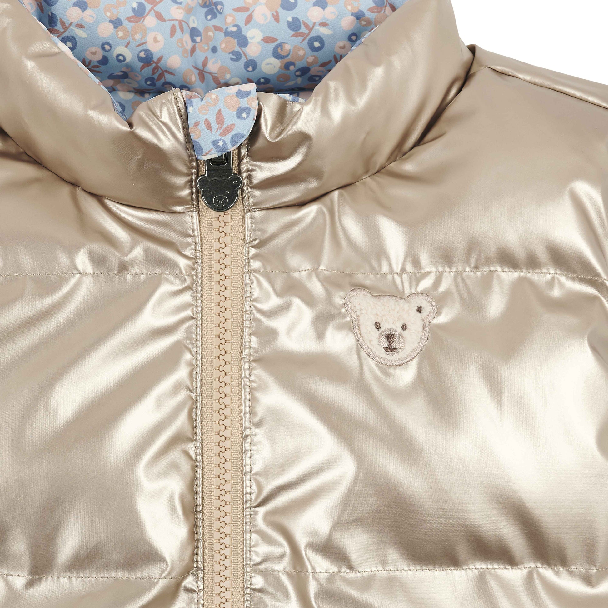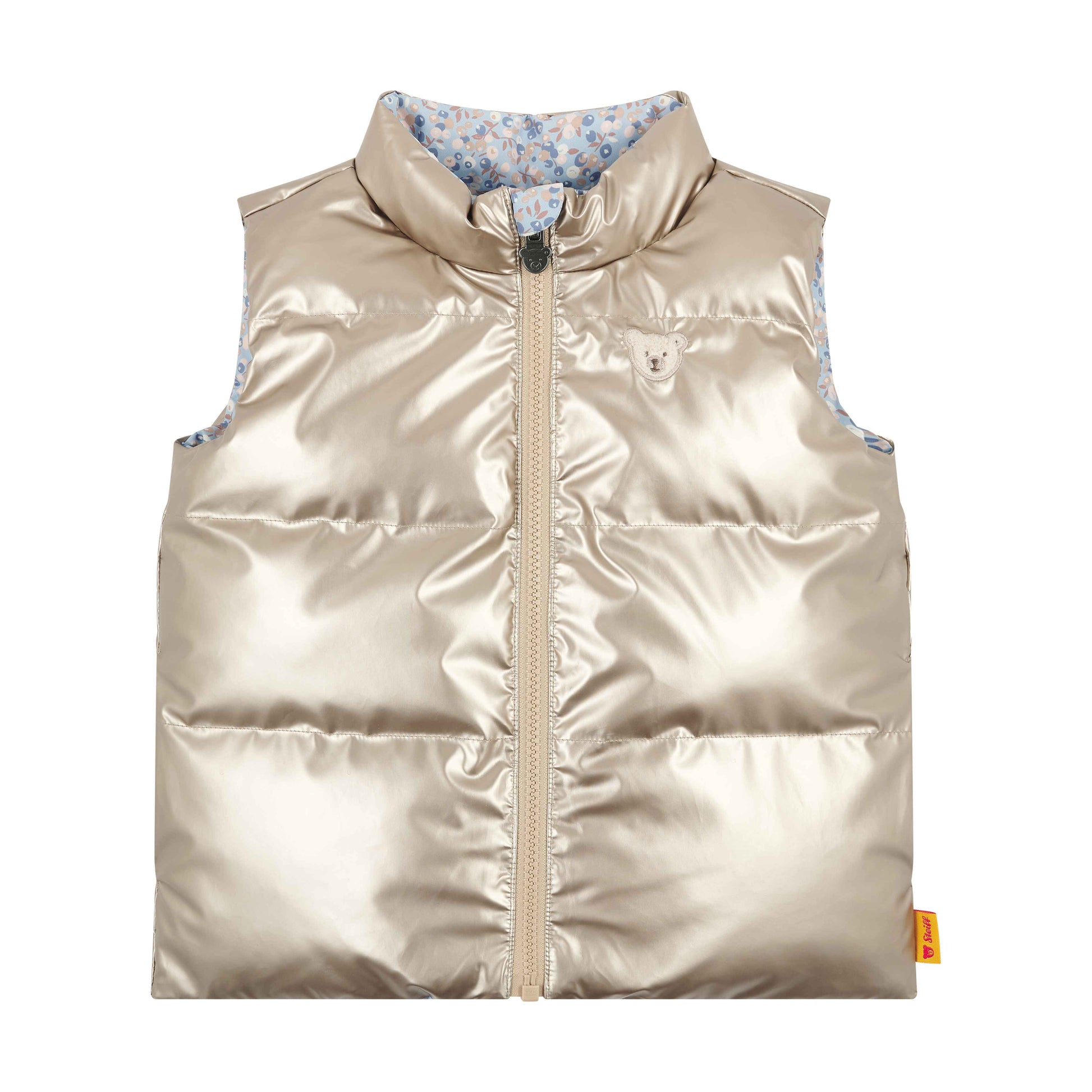 Diese vielseitige Wendeweste bietet gleich zwei stylische Looks in einem. Die eine Seite zeigt sich mit zartem Allover-Blumenprint, die andere Seite schimmert edel durch ihre goldene Metallic-Beschichtung – beide Varianten sind weich gefüttert und leicht wattiert, ideal für kühlere Tage. Dank einer ökologischen BIONIC-FINISH®ECO Imprägnierung ohne Weichmacher, ist das Obermaterial wind- und wasserabweisend sowie atmungsaktiv. Ein hoher Stehkragen schützt den Hals, seitliche Taschen bieten Platz für kleine Schätze. Der Reißverschluss ist mit einem praktischen Kinnschutz versehen. Auf beiden Seiten sorgt das klassische Steiff Teddybärmotiv auf der Brust für ein liebevolles Detail.