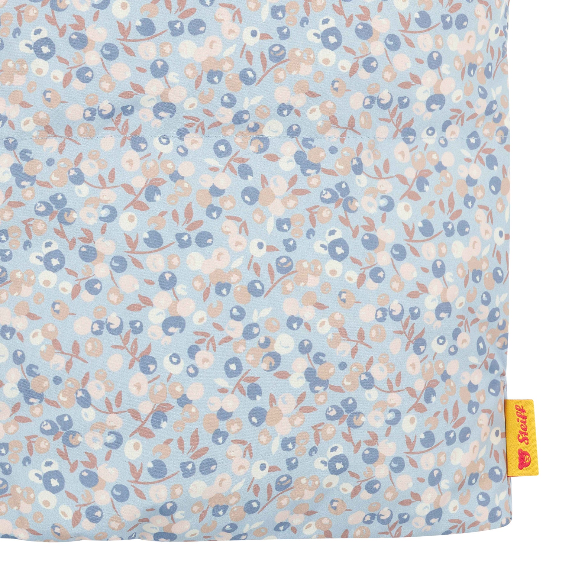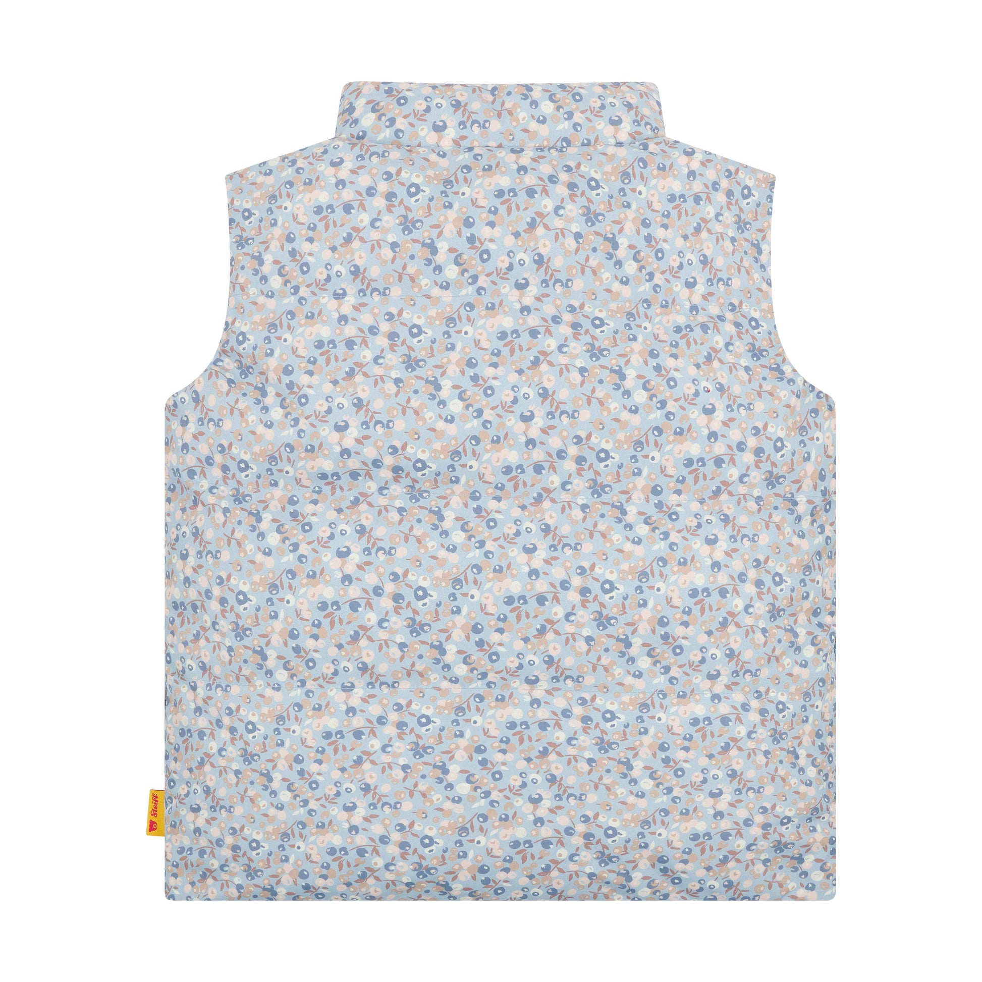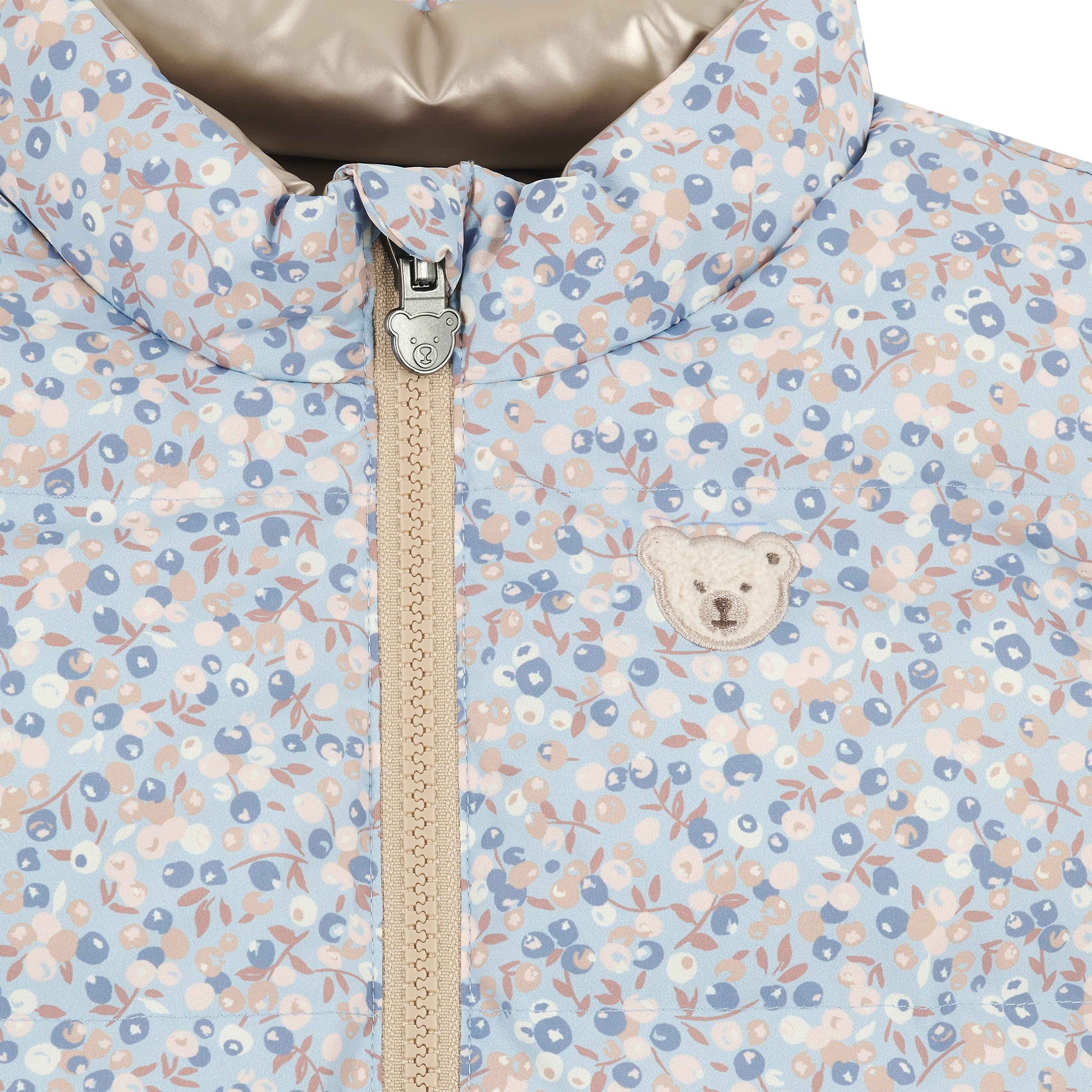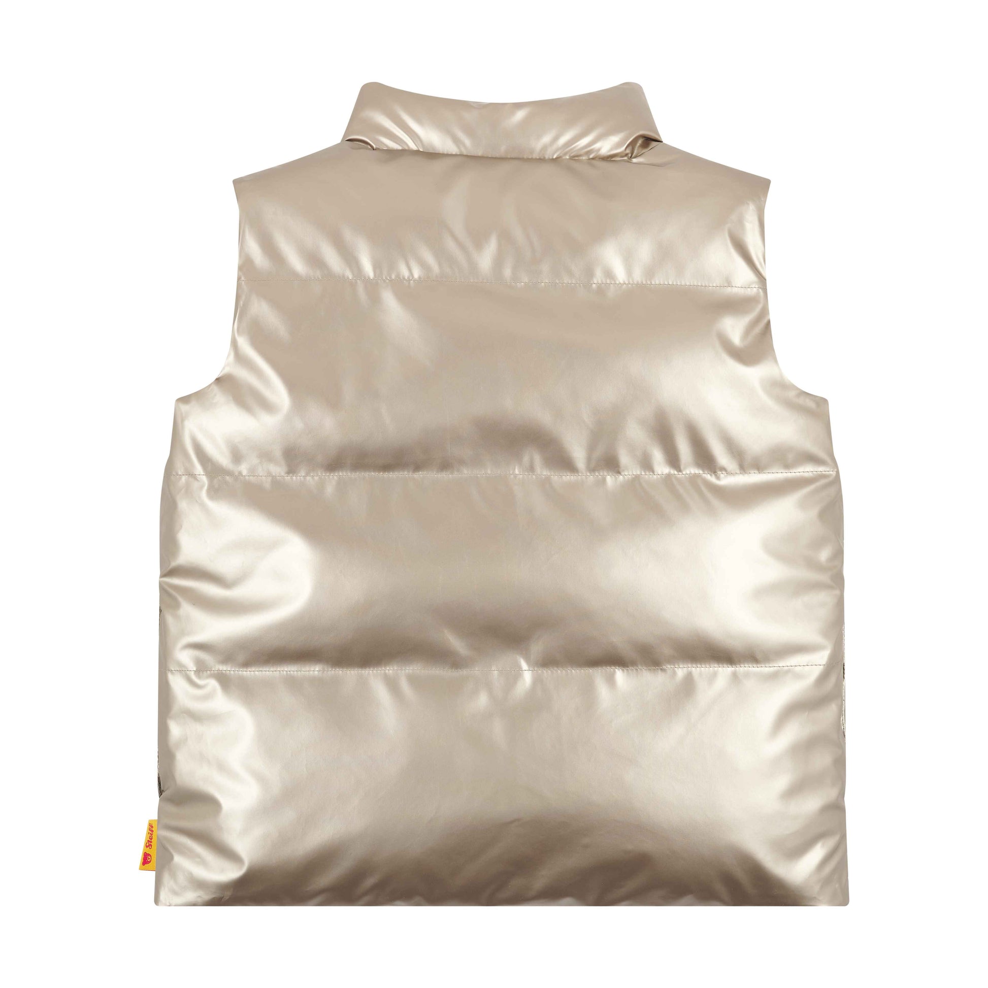 Diese vielseitige Wendeweste bietet gleich zwei stylische Looks in einem. Die eine Seite zeigt sich mit zartem Allover-Blumenprint, die andere Seite schimmert edel durch ihre goldene Metallic-Beschichtung – beide Varianten sind weich gefüttert und leicht wattiert, ideal für kühlere Tage. Dank einer ökologischen BIONIC-FINISH®ECO Imprägnierung ohne Weichmacher, ist das Obermaterial wind- und wasserabweisend sowie atmungsaktiv. Ein hoher Stehkragen schützt den Hals, seitliche Taschen bieten Platz für kleine Schätze. Der Reißverschluss ist mit einem praktischen Kinnschutz versehen. Auf beiden Seiten sorgt das klassische Steiff Teddybärmotiv auf der Brust für ein liebevolles Detail.