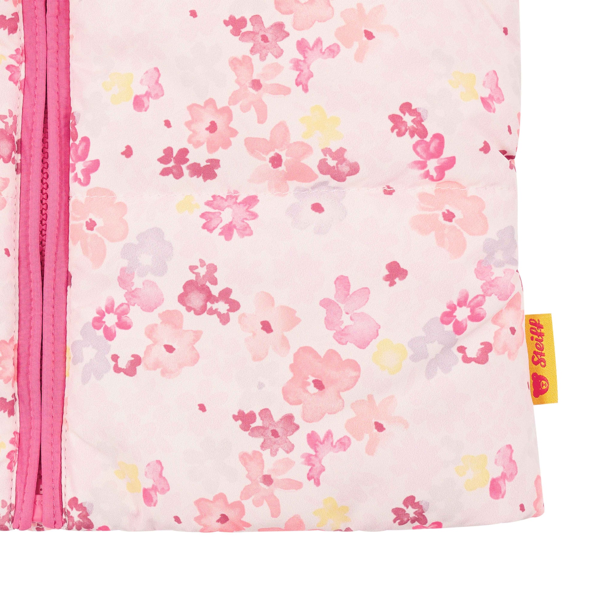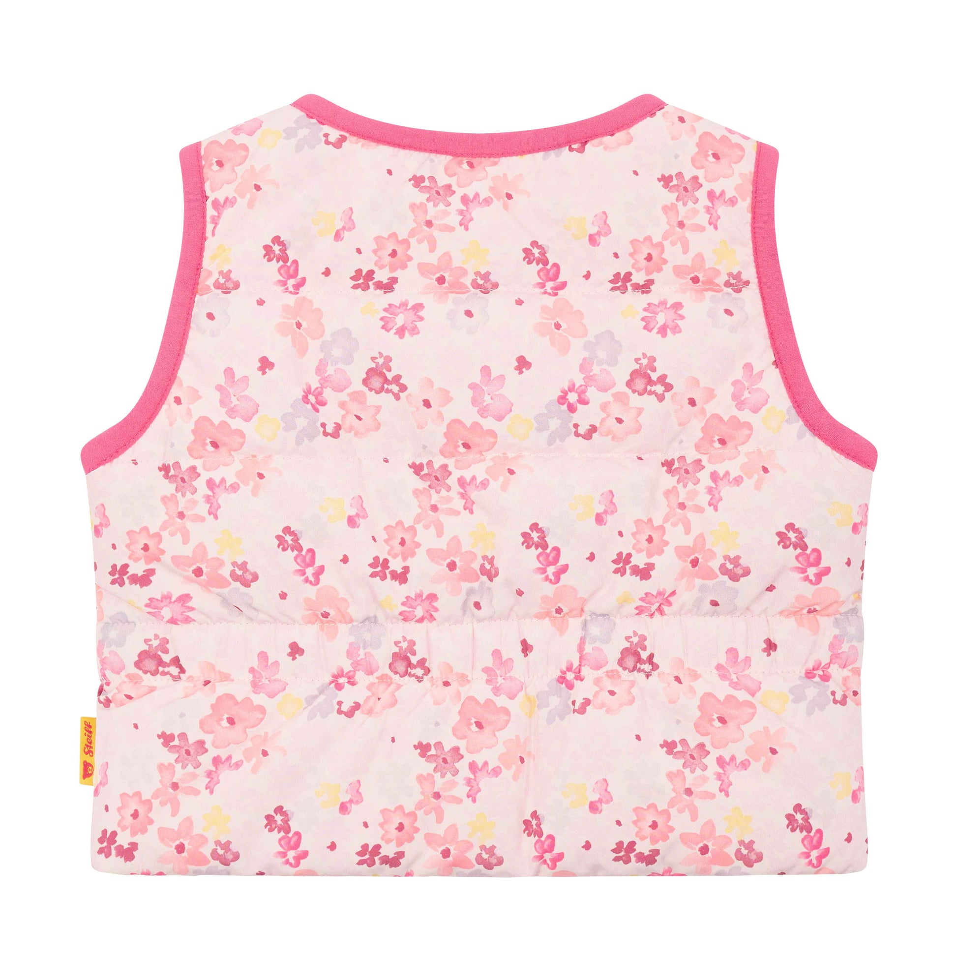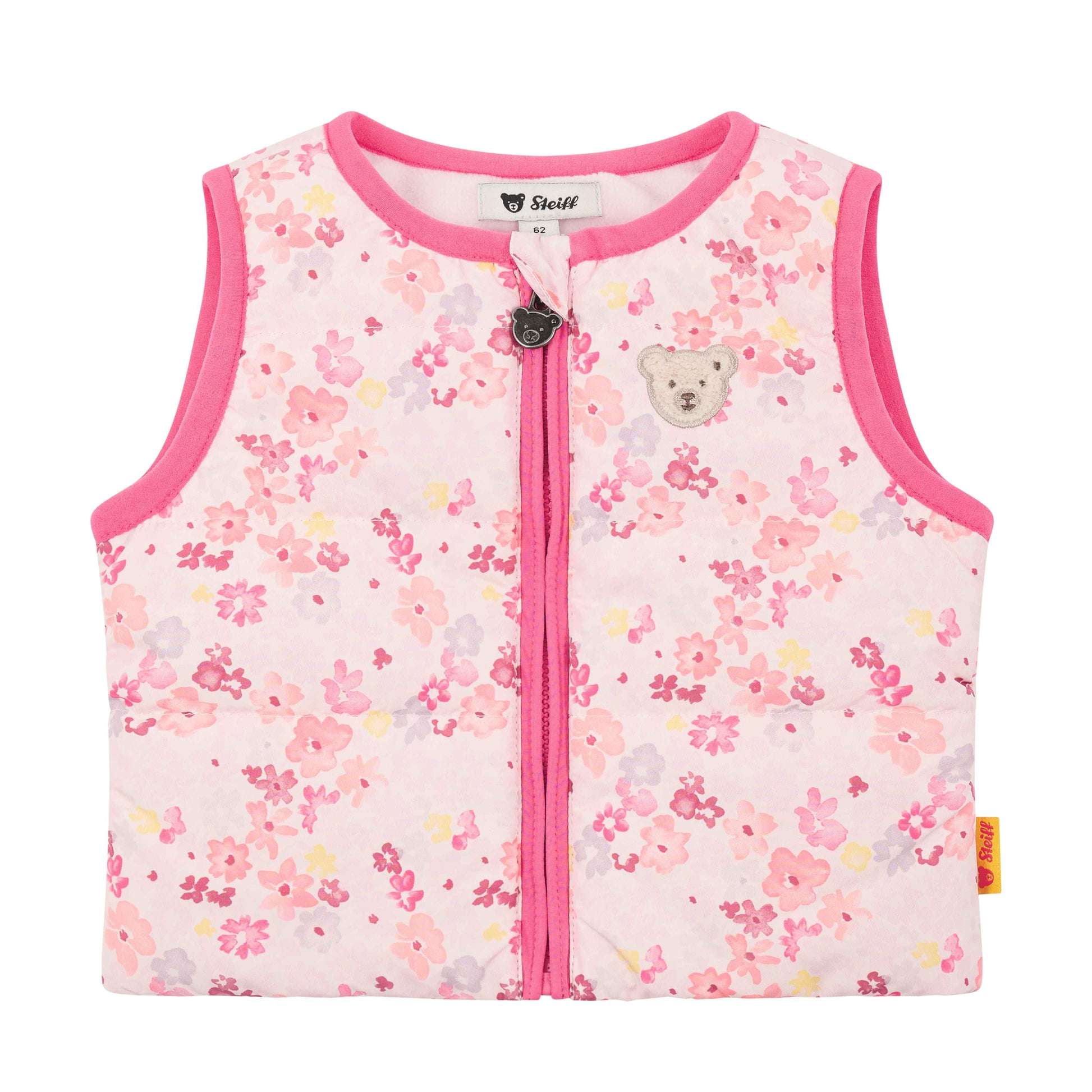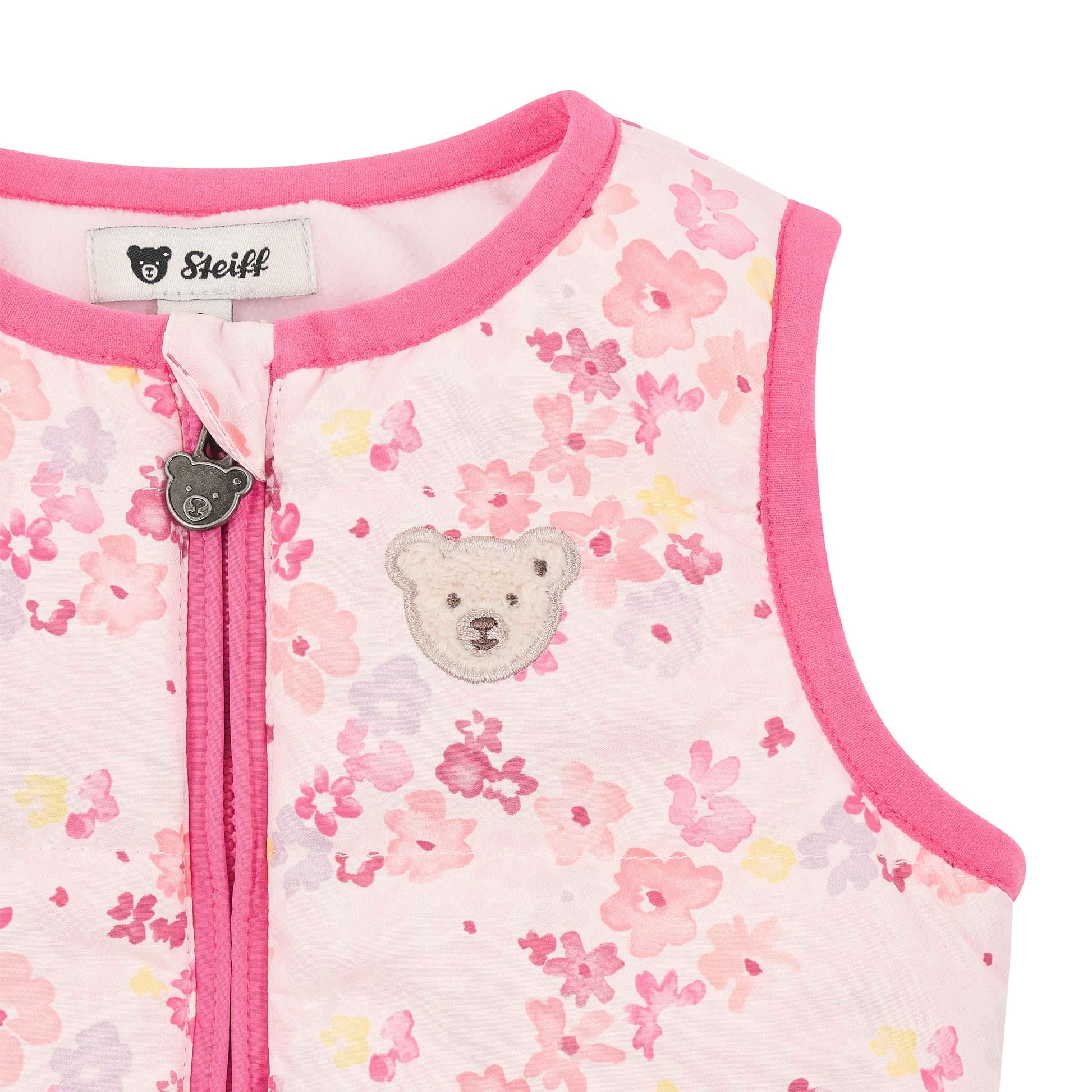 Diese bezaubernde, rosafarbene Weste mit verspieltem Blumenprint hält kleine Entdeckerinnen wunderbar warm und sieht dabei einfach entzückend aus. Das gesteppte, leicht wattierte Material bietet kuscheligen Tragekomfort, während die wasserabweisende und atmungsaktive Imprägnierung vor kleinen Wetterüberraschungen schützt. Liebevolle Details wie der Kontrastbesatz und der elastische Rückeneinsatz sorgen für einen perfekten Sitz. Der praktische Reißverschluss mit niedlichem Teddybär-Detail und Kinnschutz erleichtert das Anziehen. Abgerundet wird die Weste durch das süße Steiff Teddybärmotiv – ein fröhlicher Begleiter für jeden Ausflug!