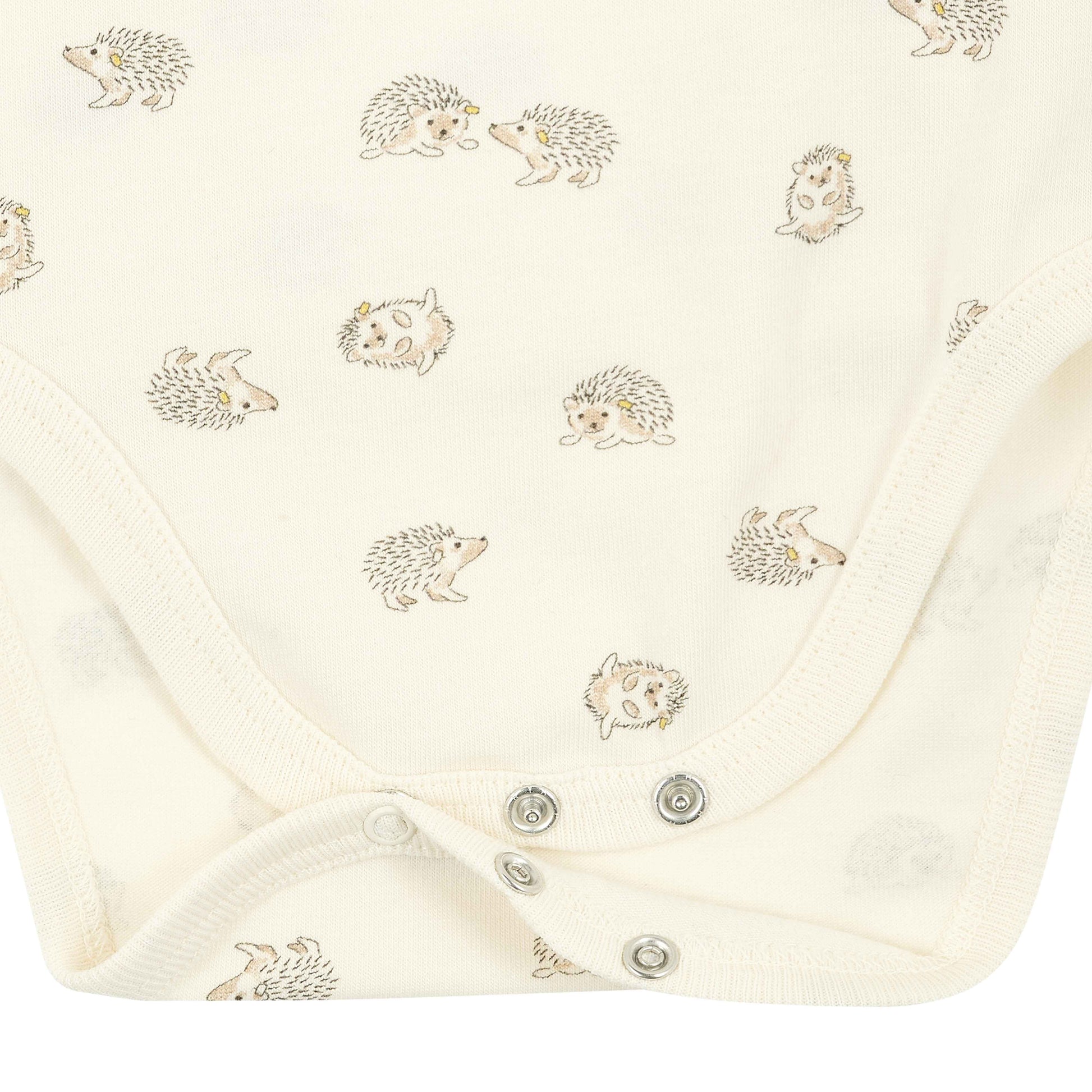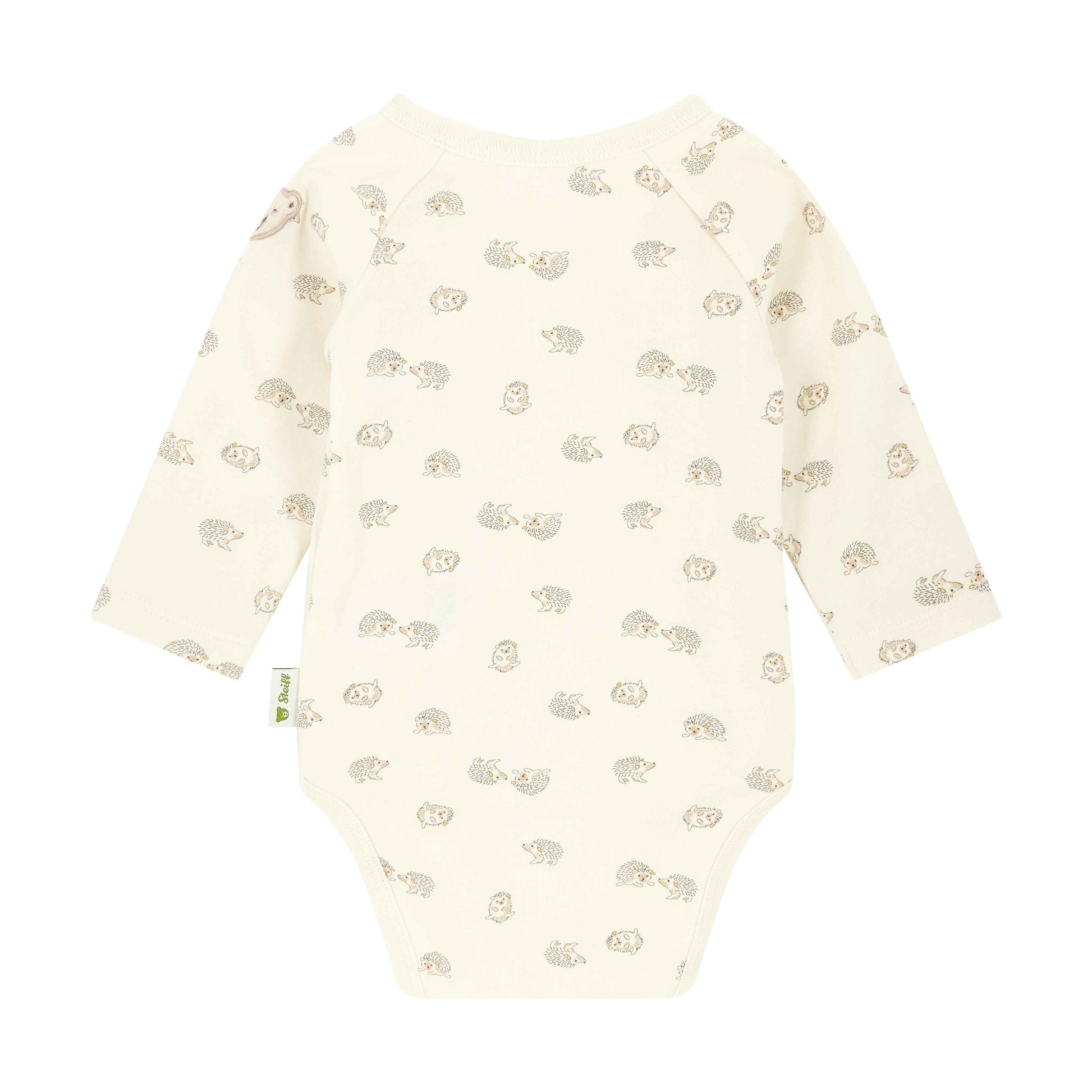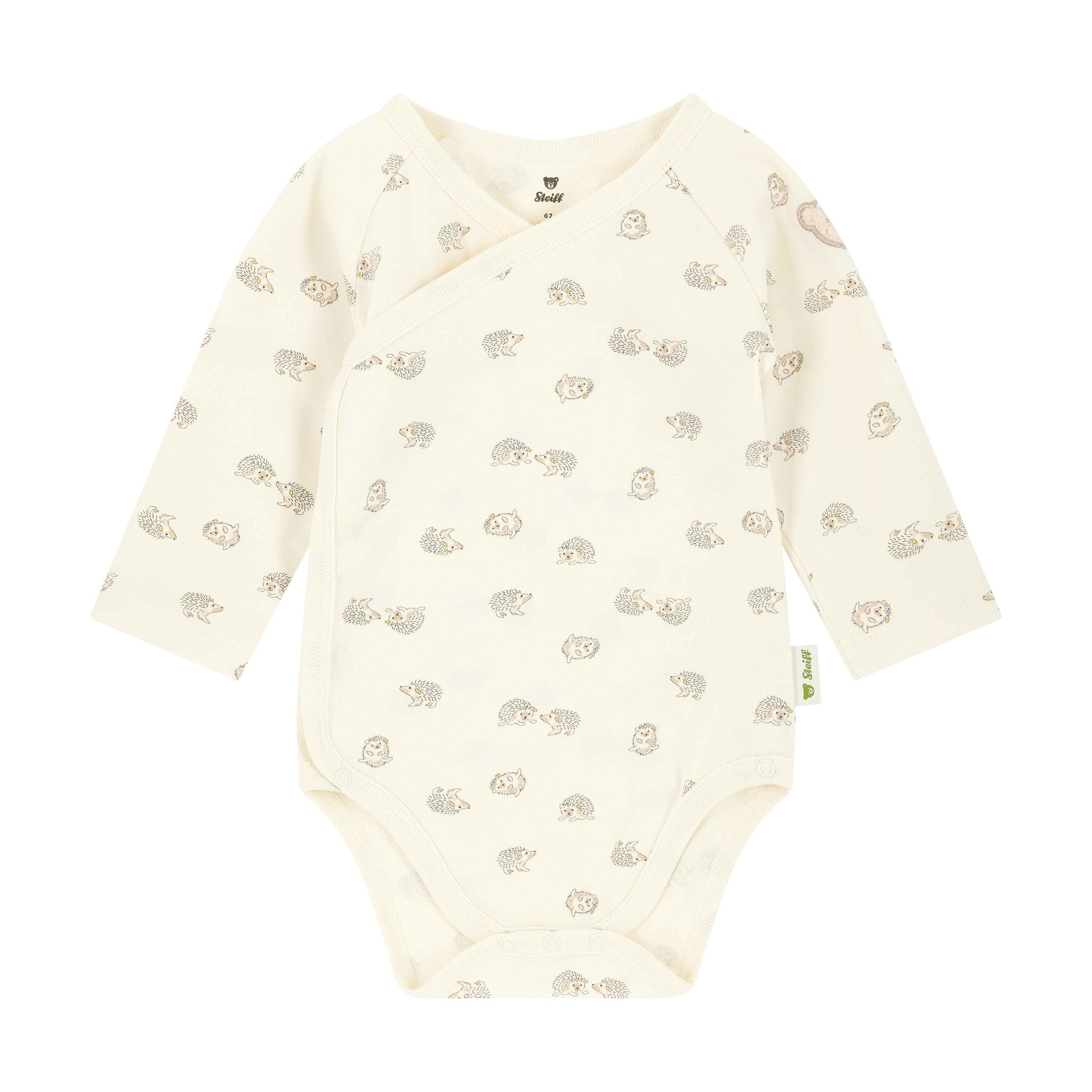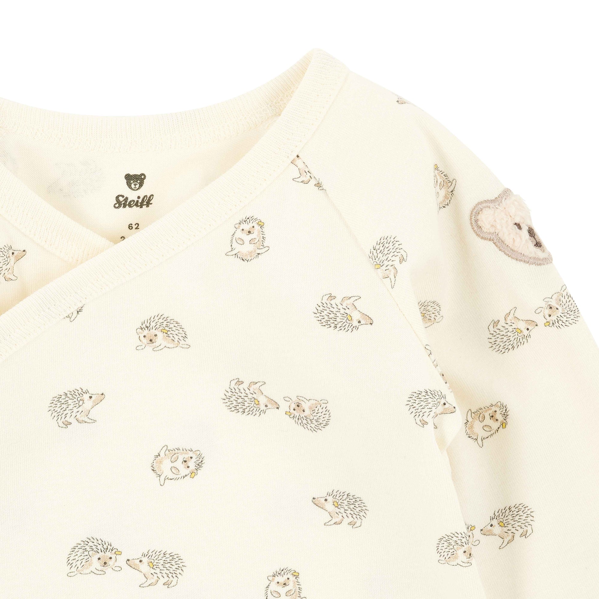 Weich, praktisch und einfach goldig – dieser langärmelige Wickelbody bietet komfortables Anziehen für kleine Weltentdecker und Weltentdeckerinnen. Der zarte Allover-Print mit kleinen Igeln sorgt für verspielte Akzente und macht den Body zu einem besonderen Hingucker im Alltag. Dank seitlicher Druckknopfleiste und Druckknöpfen im Schrittbereich gelingt das An- und Ausziehen kinderleicht. Hergestellt aus angenehmem Single Jersey, bietet der Body sanften Tragekomfort auf zarter Babyhaut. Auf dem Ärmel sorgt das klassische Steiff Teddybärmotiv für ein liebevolles Detail und ein Gefühl von Geborgenheit.