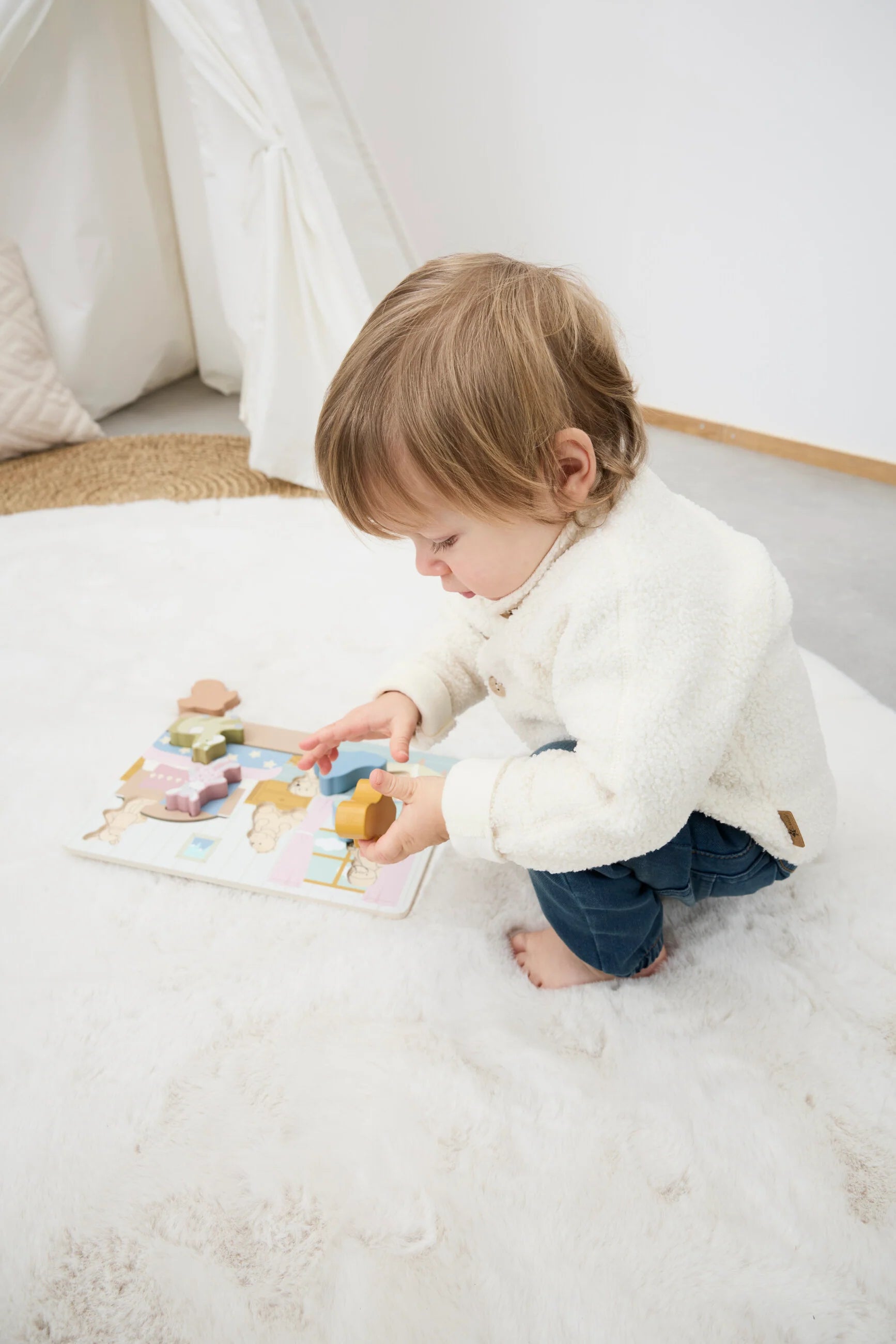 - Feinmotorik: Kleine Hände greifen die liebevoll gestalteten Tierfiguren und setzen sie passgenau ein.