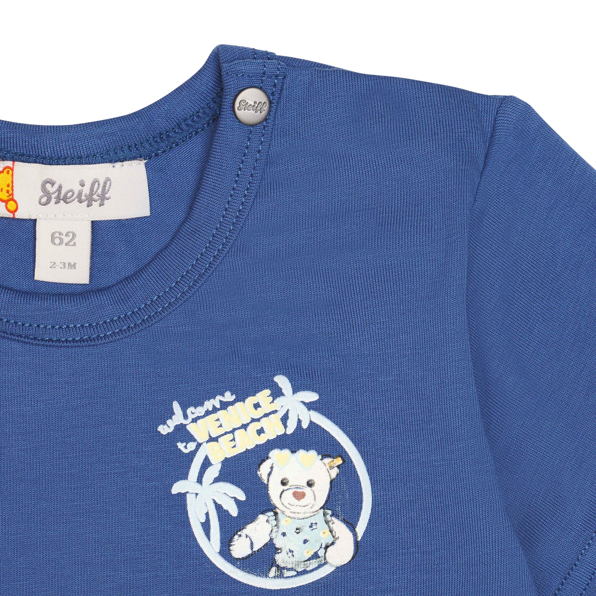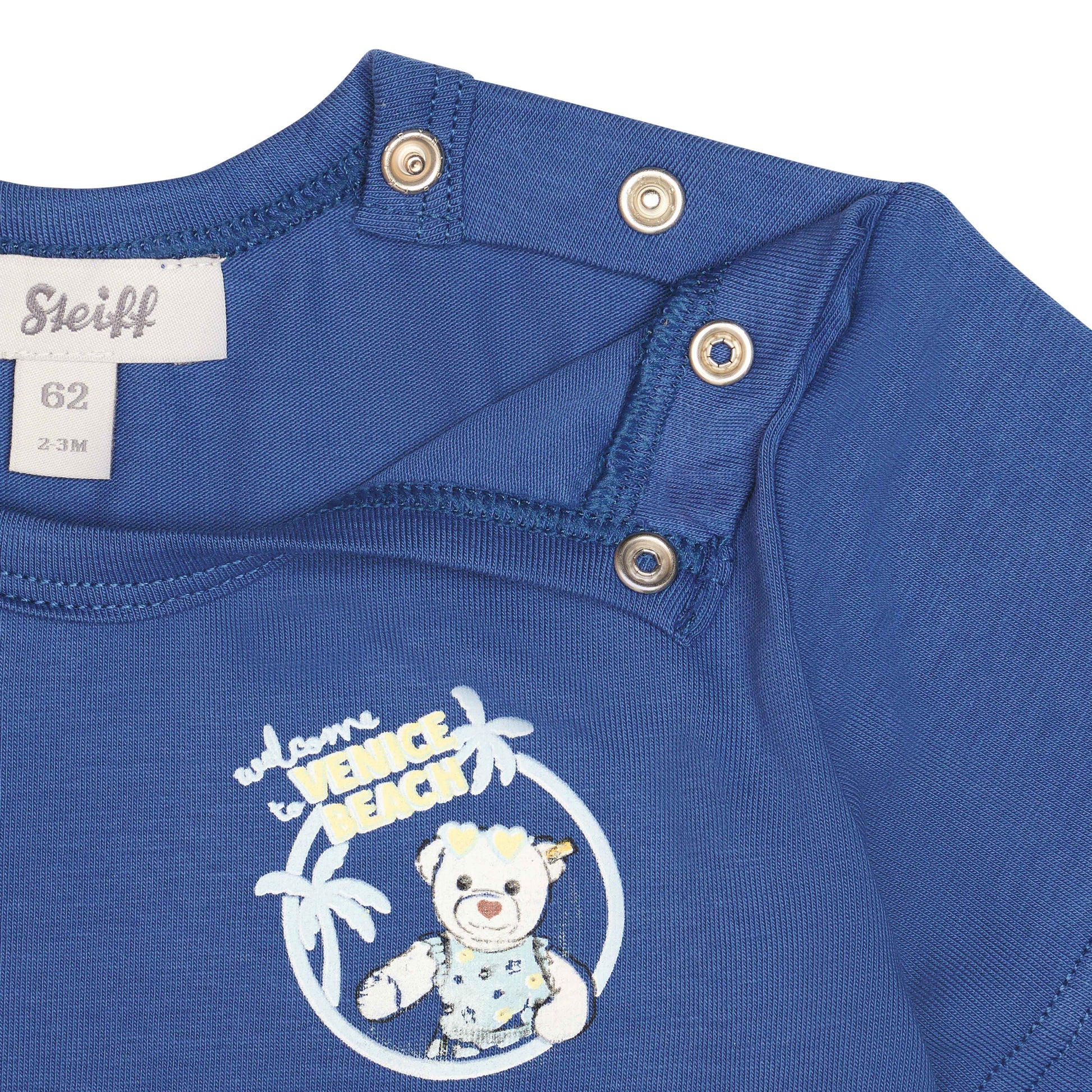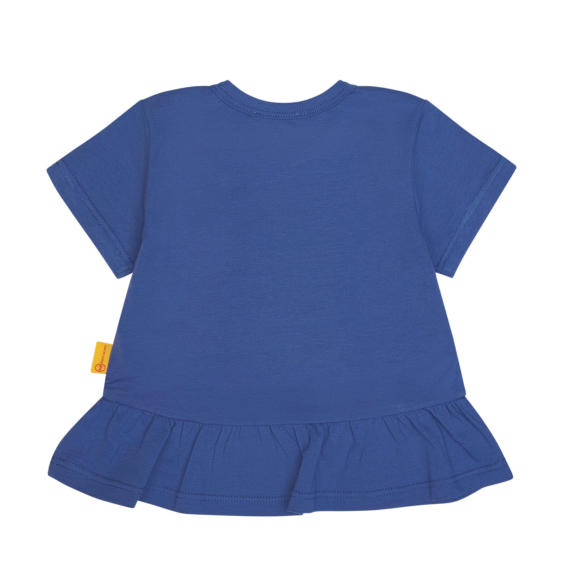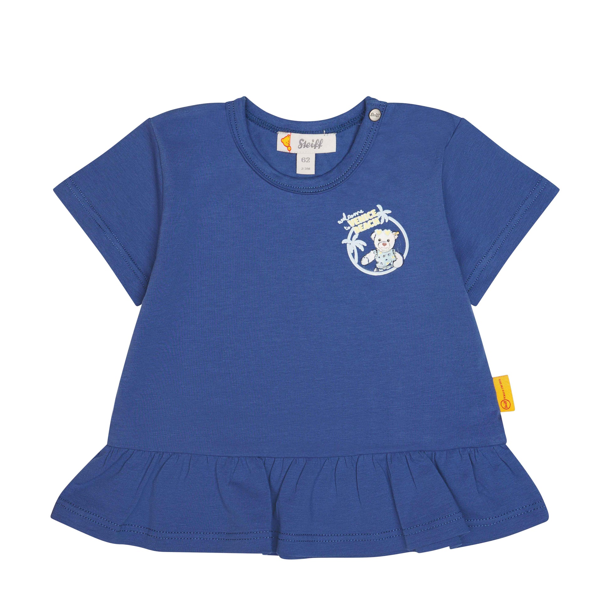 Süßes Kurzarm-T-Shirt für Babymädchen, in dunkelblau und hellblau mit kleinem Mila Teddybär-Print auf der Brust. Die leicht ausgestellte Form mit Volants zaubert mädchenhaften Charme, der leichte Single-Jersey ist perfekt für den Sommer!