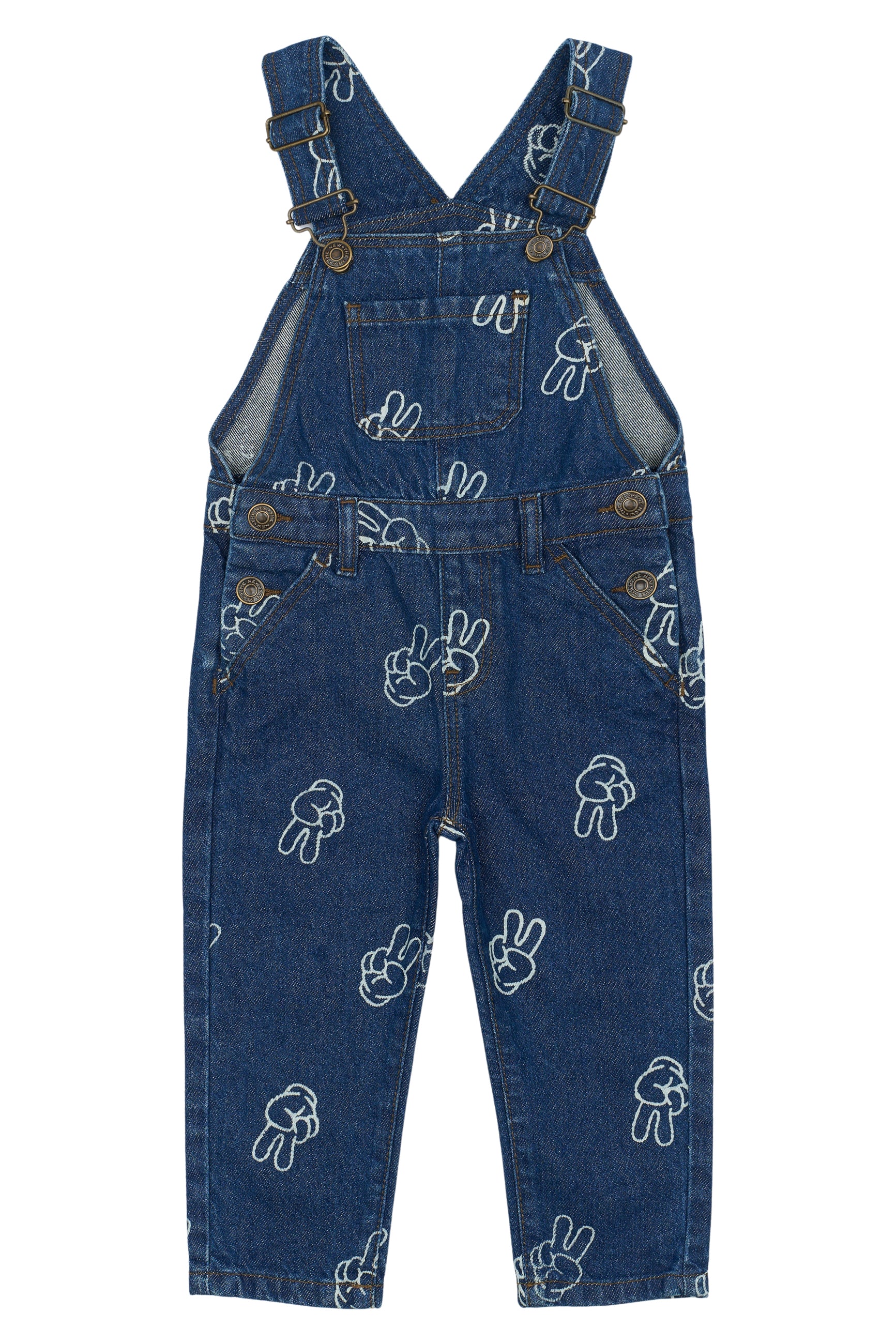 Ein cooler Klassiker mit einem Augenzwinkern: Diese Jeanslatzhose bringt Schwung in den Alltag. Der lässige Denim-Look wird durch das allover eingestickte Peace-Handzeichen charmant aufgelockert.