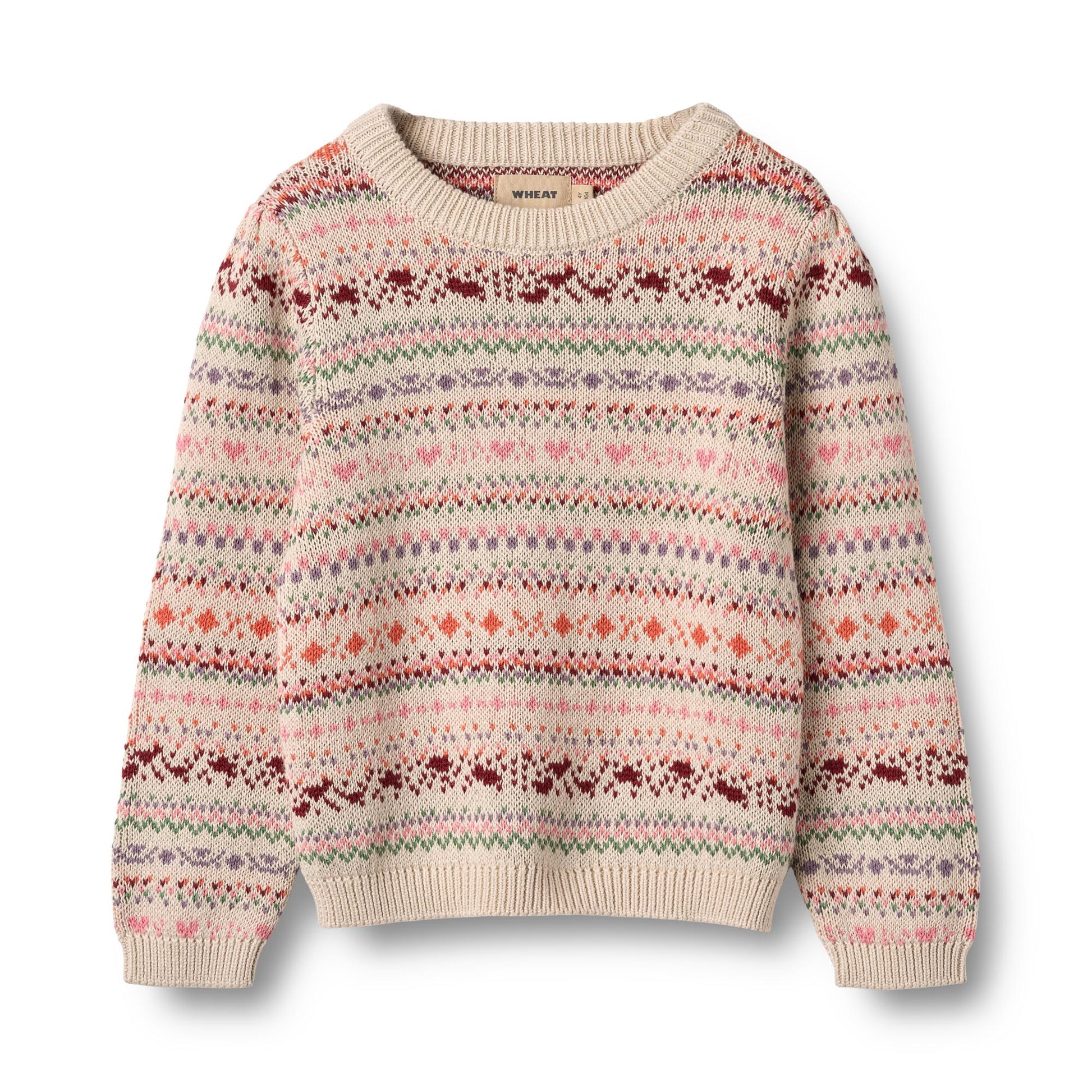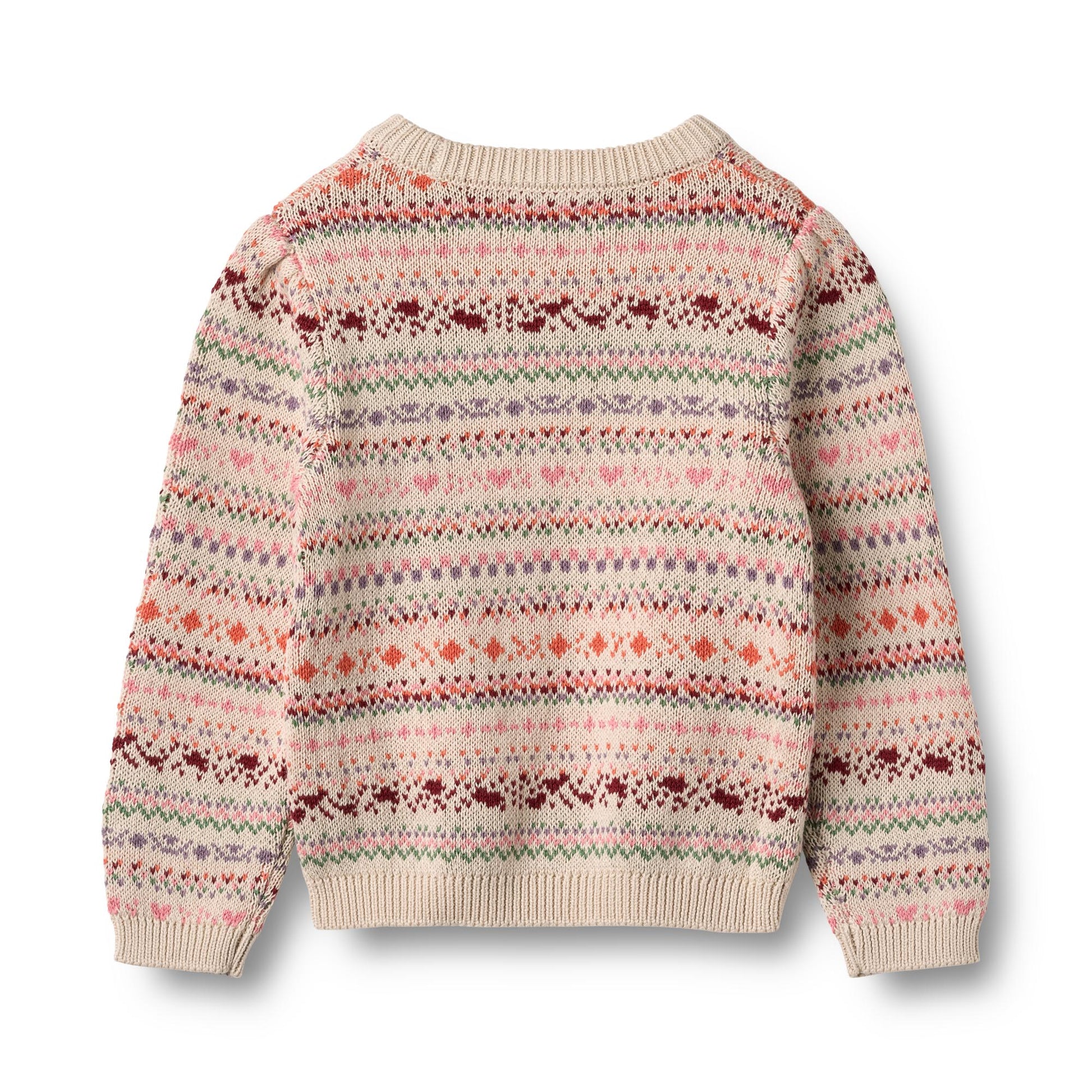 Ein weicher Jacquard Pullover aus 100 % Bio-Baumwolle mit liebevoll eingestricktem, buntem Muster. Der Rundhalsausschnitt sorgt für angenehmen Tragekomfort. Ideal für die kühleren Tage und perfekt kombinierbar zu Jeans, Leggings oder Röcken.