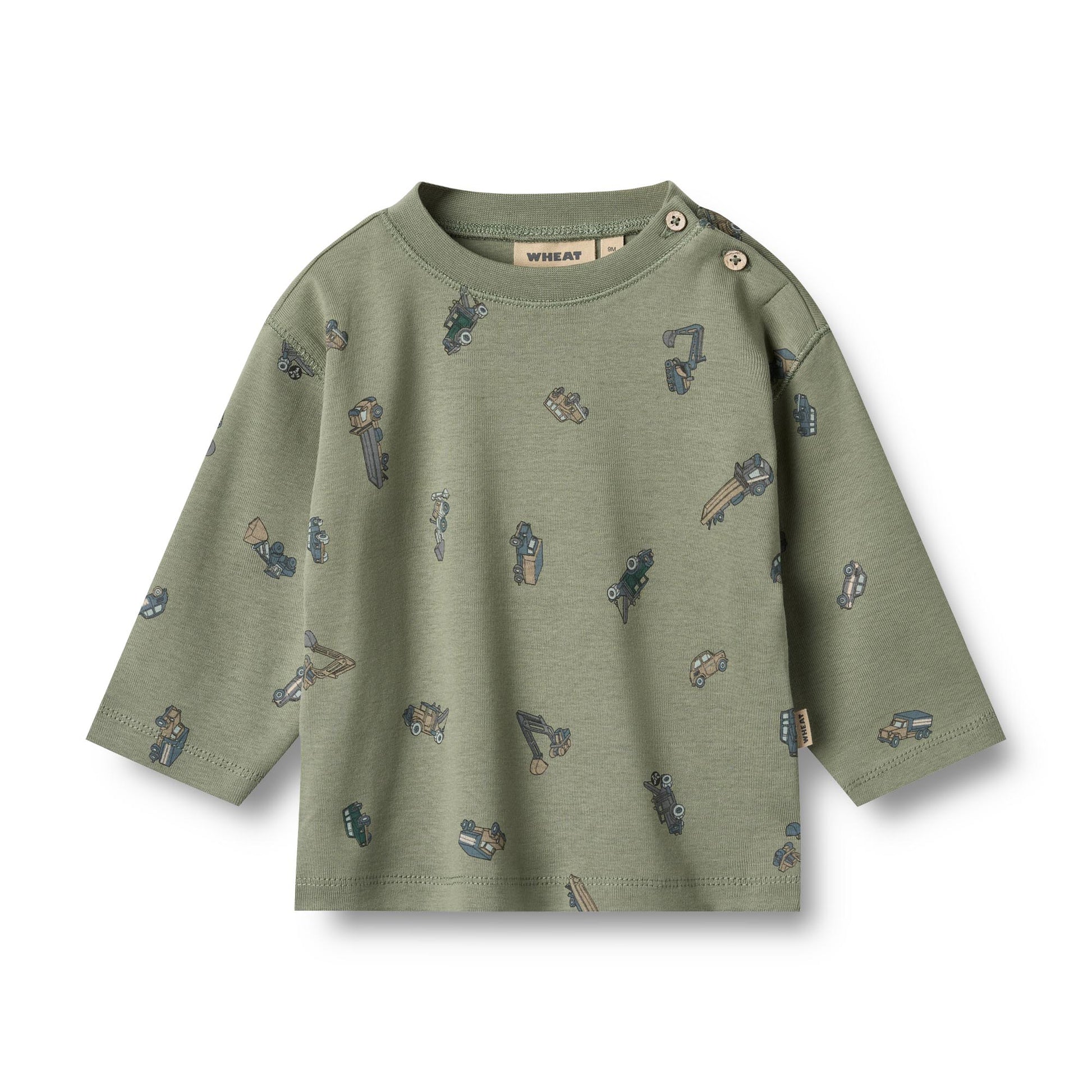 Dieses Langarmshirt für Babys in einem sanften Olivgrün begeistert mit einem verspielten Allover-Print aus Baustellenfahrzeugen – perfekt für kleine Technik-Fans.