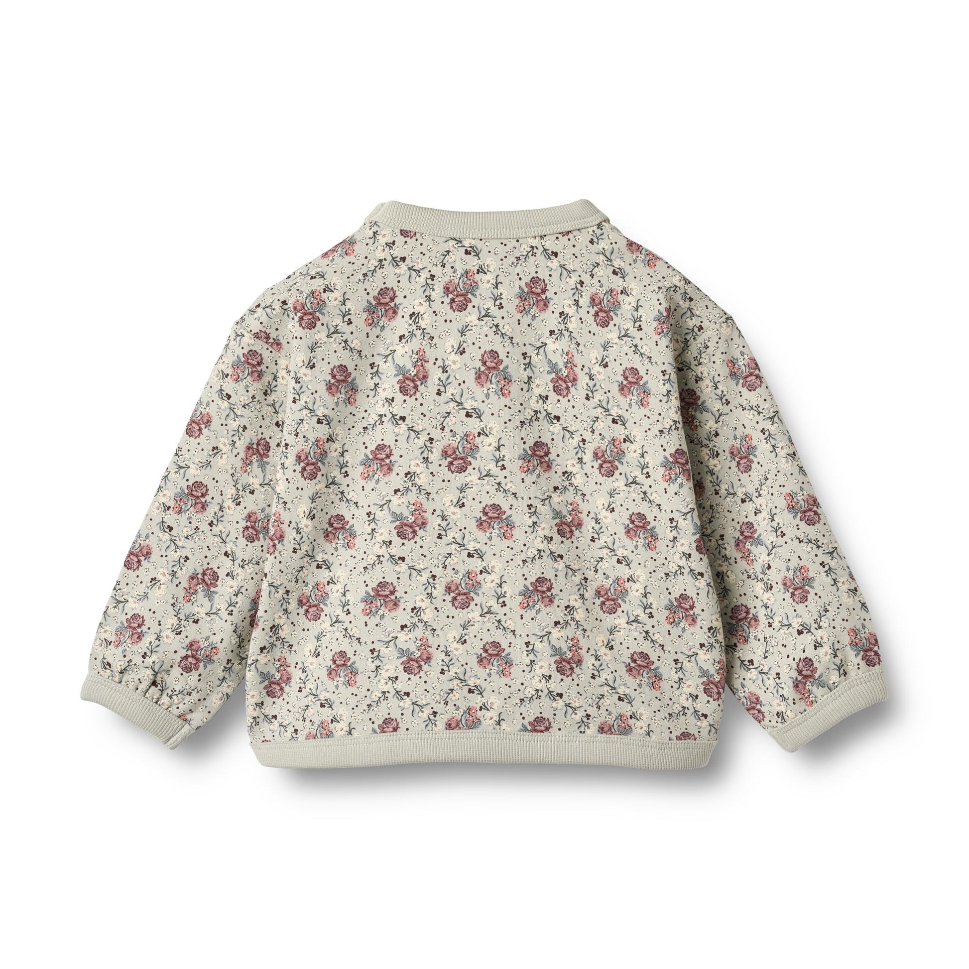 Ein verspieltes Sweatshirt für Babys mit zartem Allover-Blumenprint in Rosé- und Blautönen auf hellem Untergrund.